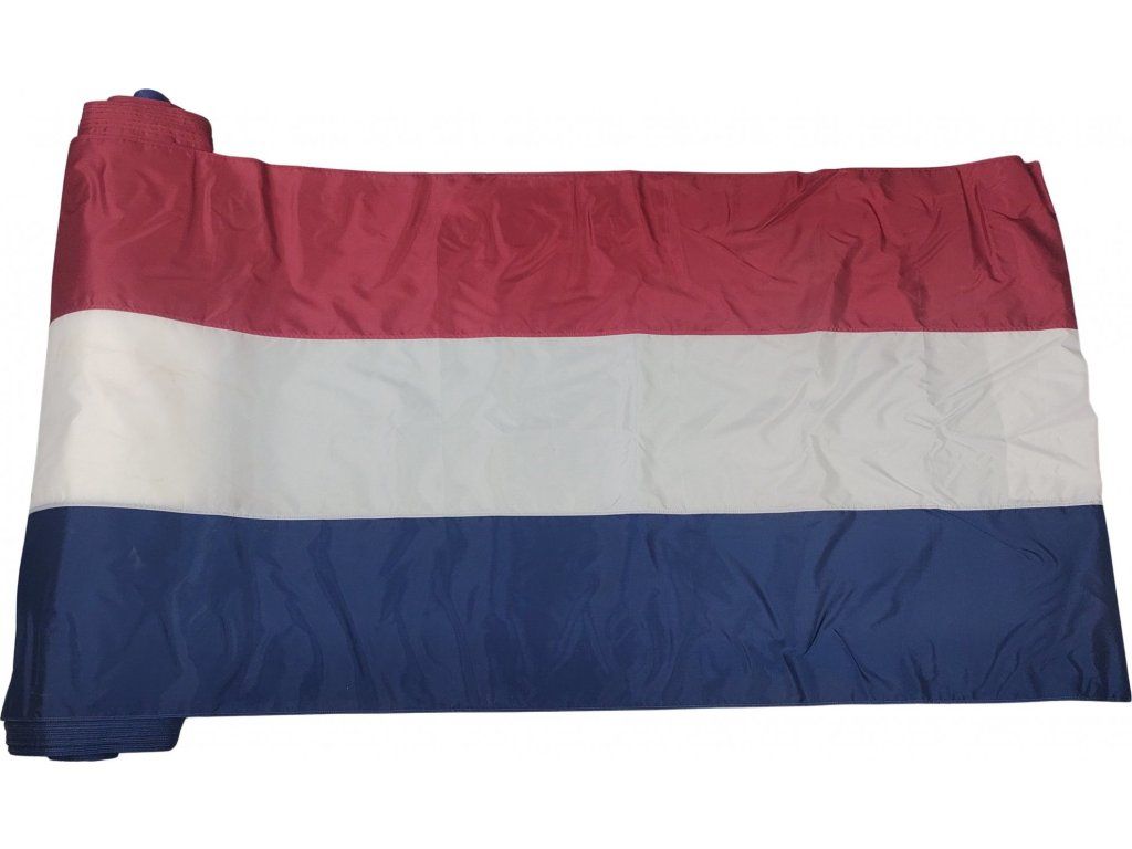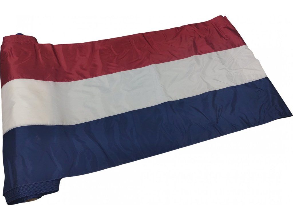 50-metrová role syntetické vlajkoviny v barvách trikolóry Nizozemska (červená, bílá, modrá), vhodná k další výrobě vlajek nebo jako dekorační tkanina.