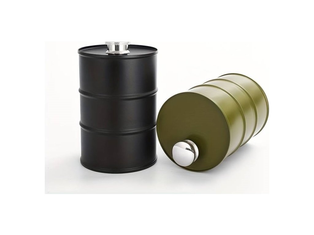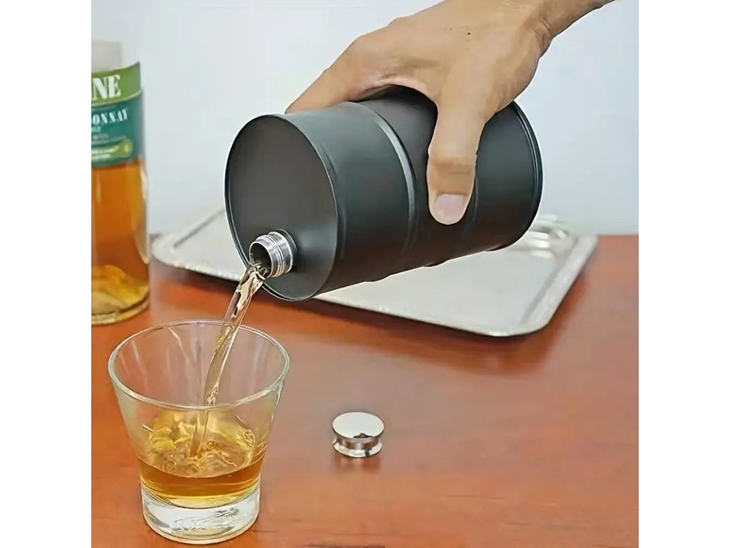 - Alkoholová placatka ve tvaru kovového barelu černého designu.