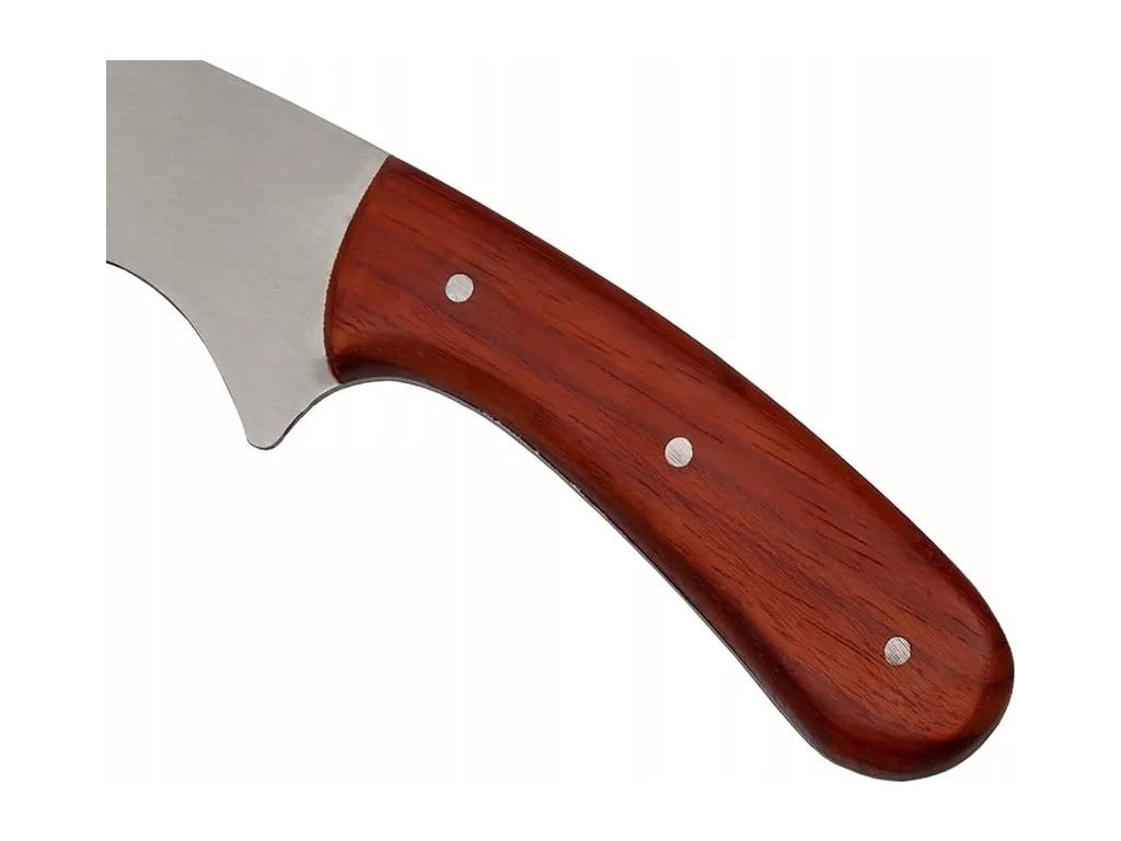 - Dřevěná rukojeť, ergonomicky tvarovaná, připevněna k čepeli pomocí nýtů.