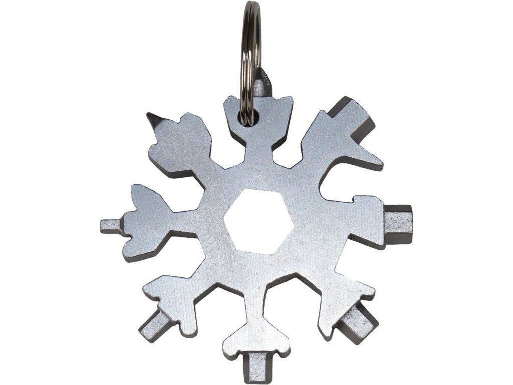 Multifunkční nerezové nářadí ve tvaru sněhové vločky s kroužkem na klíče. Vyrobeno z nerezové oceli. Nástroj obsahuje různé funkce, jako jsou nástrčné klíče, imbusové klíče, otvírák a šroubovák. Díky svému designu je praktickým doplňkem pro každodenní nošení (EDC).