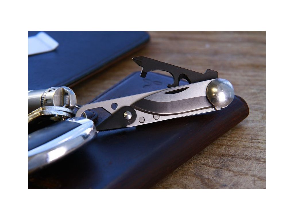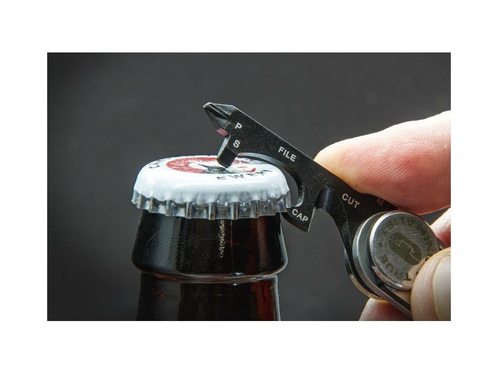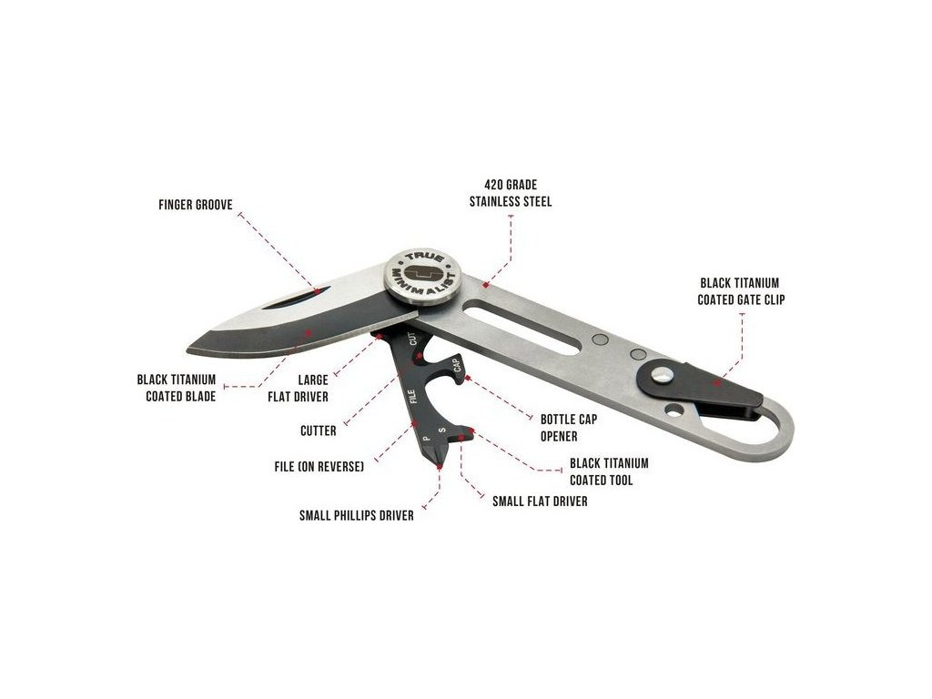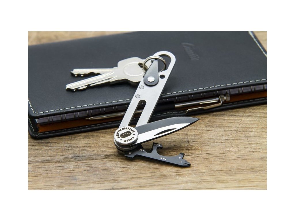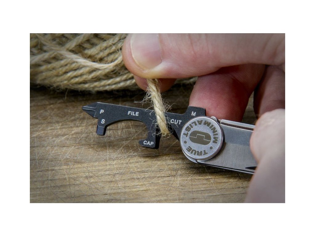 Multitool Minimalist od britské firmy True Utility je určen těm, kteří chtějí nosit po kapsách skutečně jen minimum. Lehký a tenký kapesní multitool z nerezové oceli, potažené vrstvou černého titanu, nabízí 7 funkcí - vedle zavíracího nože má křížový šroubovák, malý a velký plochý šroubovák, otvírák na lahve, pilník a řezač drátu. Pomocí karabinky ho můžete připnout ke klíčům nebo k batohu.