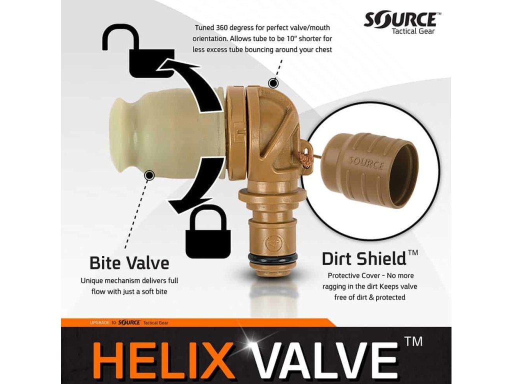 - vysokoprůtokový ventil Helix Bite Valve poskytuje plný průtok pouze s jemným záběrem