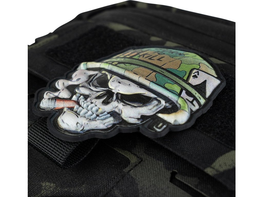 Plastová (PVC) nášivka zobrazuje stylizovanou lebku s vojenskou tematikou.