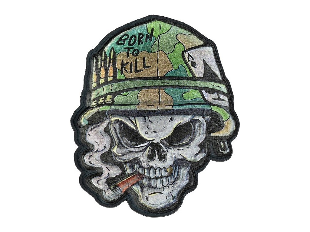 Text: Na horní části přilby je anglický nápis "BORN TO KILL", což je v českém překladu "ZROZEN K ZABÍJENÍ".