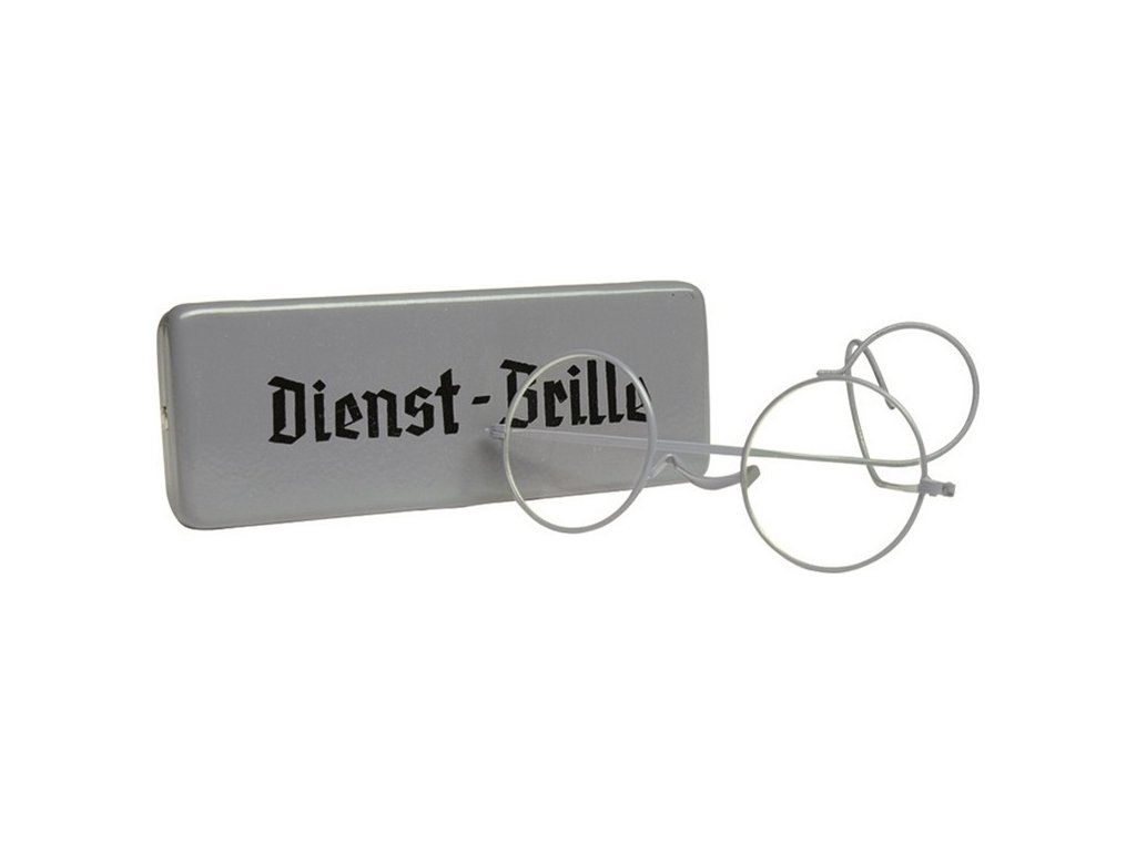 - Šedé kovové pouzdro pro úschovu s nápisem Dienst-Brille v tradičním německém písmu