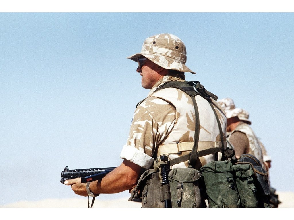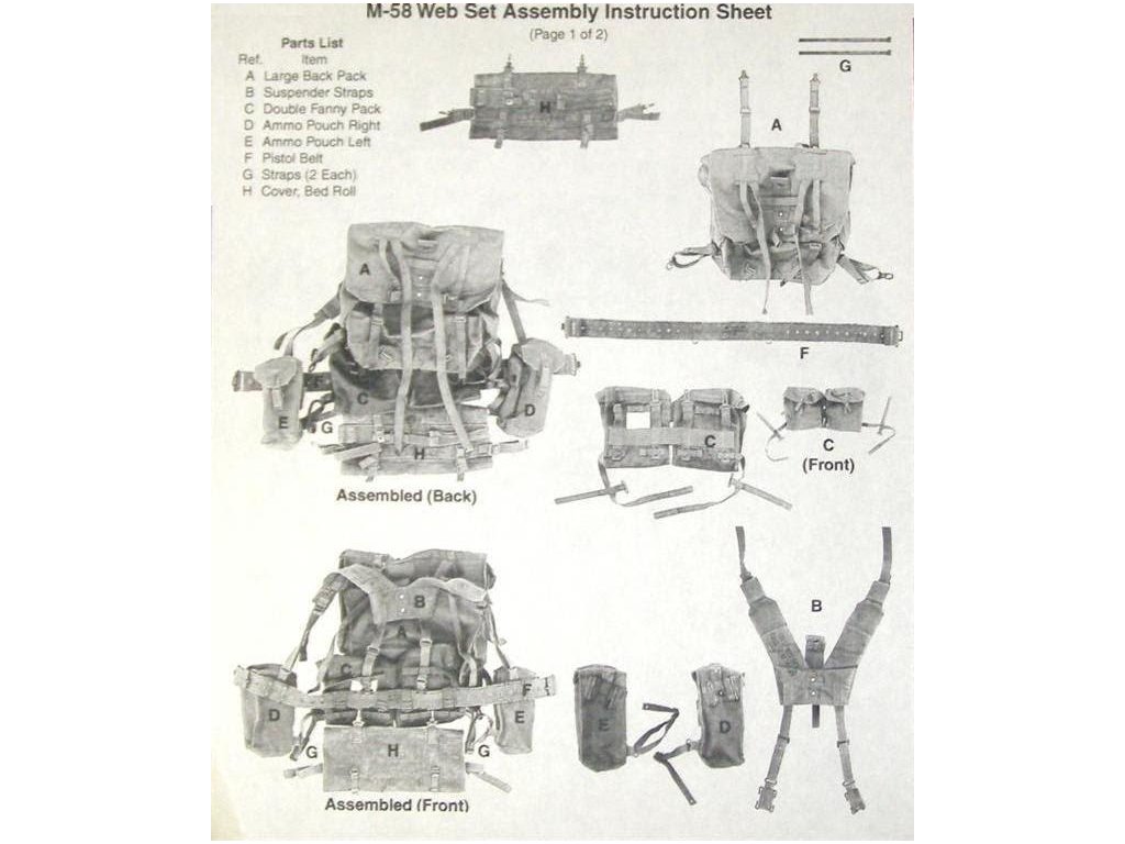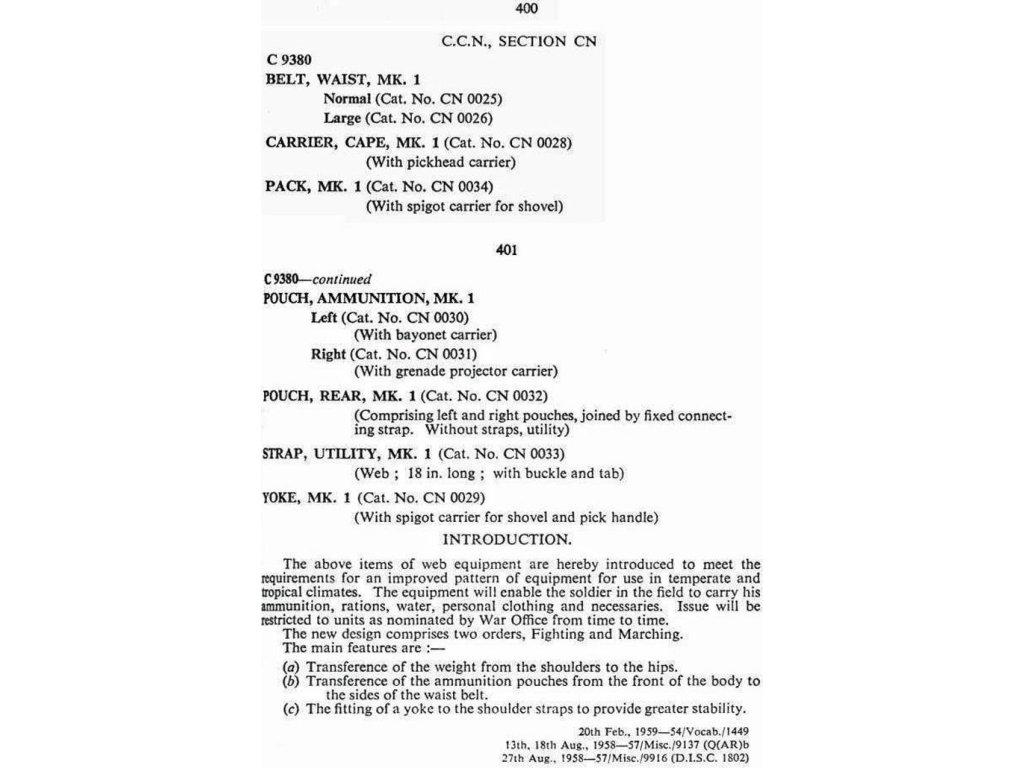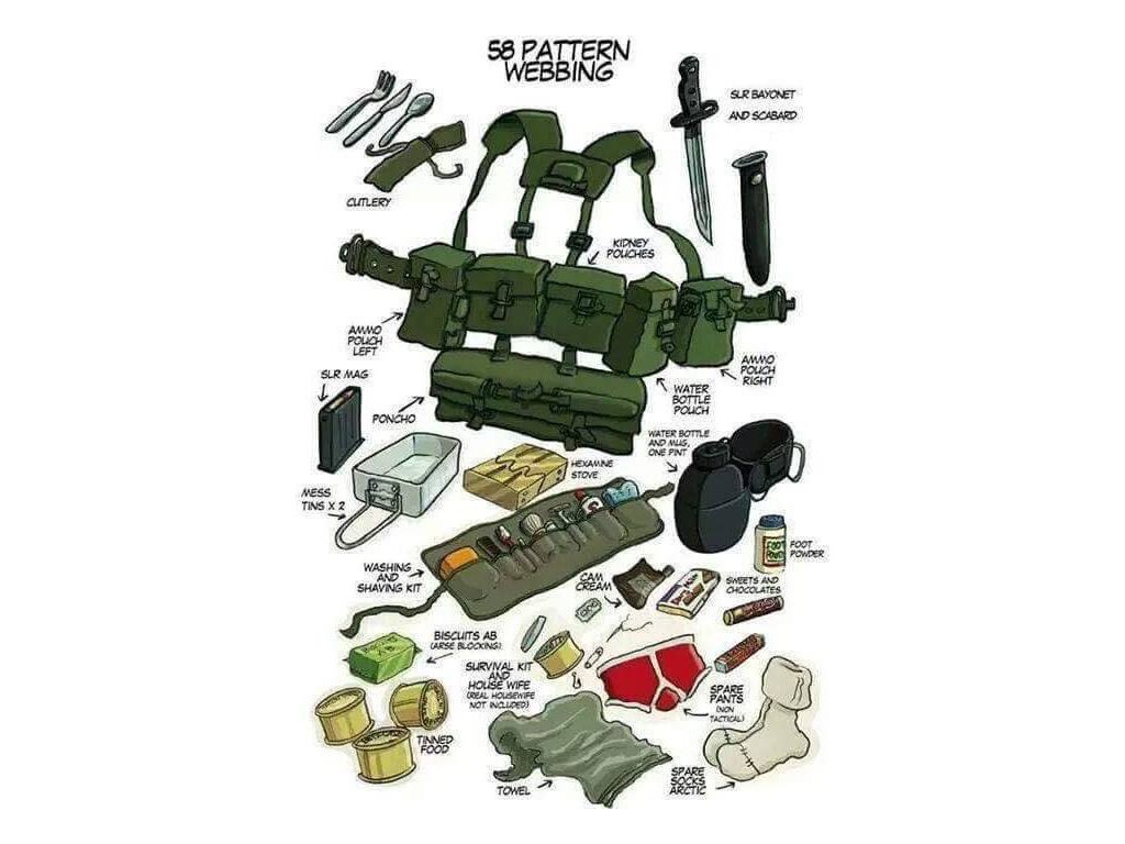 Standardní sada popruhů se vzorem z roku 1958, která byla vydána většině britského personálu, se skládala z opasku, třmenu, které podporovalo připevnění lopaty nebo krumpáče, dvou vaků na náboje pro zásobníky pro samonabíjecí pušku L1A1, samopal Sterling nebo kulomet L4A1-A9, spojený kulomet A1-7,62 mm s kulometem 7,62 mm. zbraň a/nebo L2A1/A2 a další granáty (s levým vakem s možností přenášení bajonetu v pouzdru a pravým vakem s vnější kapsou na zadní straně pro adaptér na puškový granát ENERGA), vakem na láhev s vodou (také lze vybavit hrnkem, ve kterém je uložena láhev na vodu), pár zadních „ledvinových“ vaků (pro uložení náhradního spodního prádla a ponožek, sady na mytí a holení, věcí na čištění bot, 24hodinové dávky a jakýchkoli dalších věcí, které uživatel může potřebovat mít zajištěné), role ponča nebo „nosič pláštěnky“ a velký batoh.