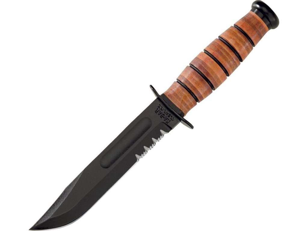 - KA-BAR U.S. Army Knife 1219 partially serrated, fixed knife, leather sheath.
