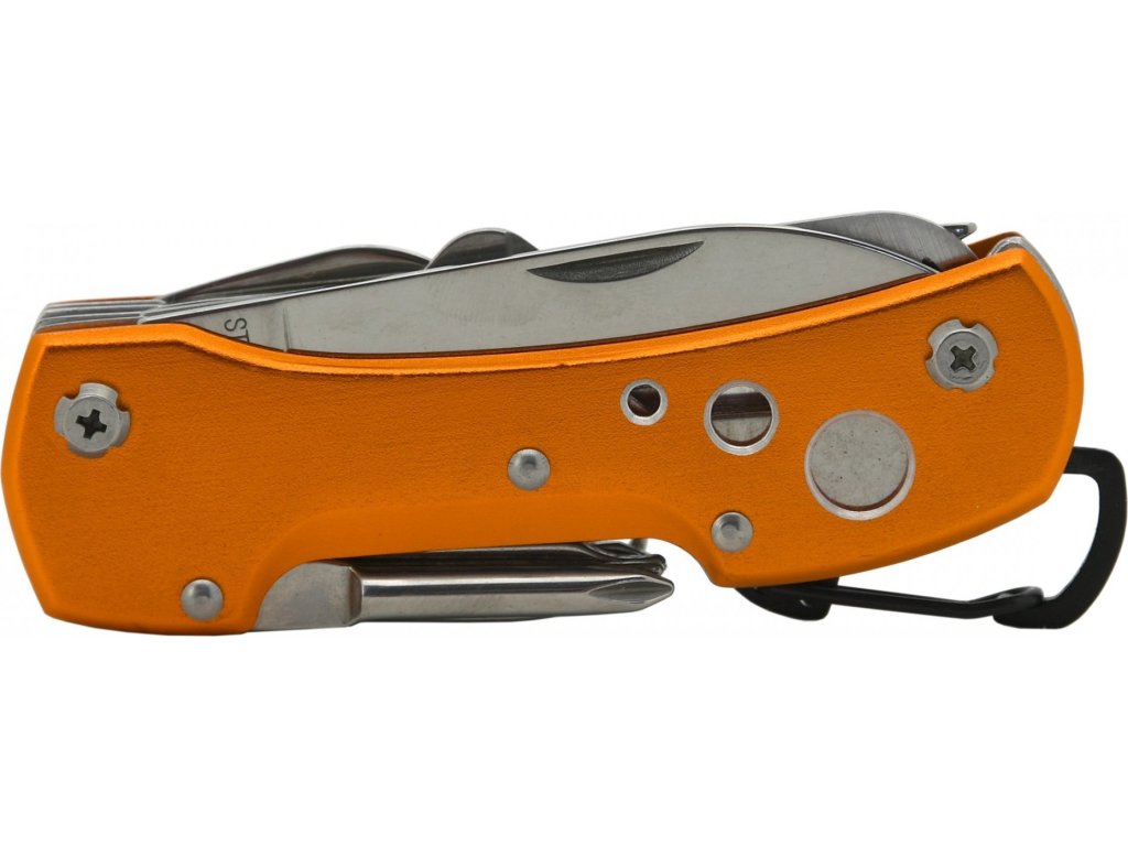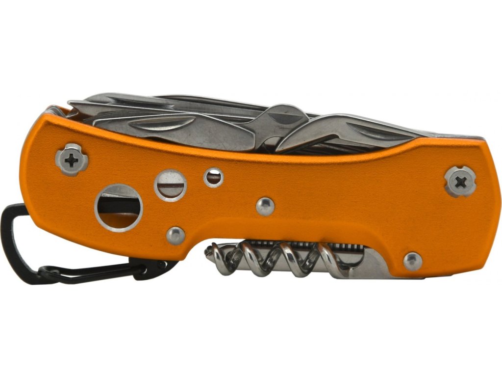Na vnitřní straně, tedy vespod rukojeti, se skrývají otvírák na plechovky, nůžtičky, škrabák na rybí šupiny, pilka na dřevo a samotný nůž délky 6 cm. Na druhé, vnější straně rukojeti se ukrývají křížový šroubovák nejběžnějších rozměrů, šídlo, pilníček, oko na hrubé šití a vývrtka na korkové špunty. Na zadní straně je rukojeť opatřena očkem pro přichycení např. na klíče a v neposlední řadě otvírákem na zátky, který může být použit i jako plochý šroubovák.