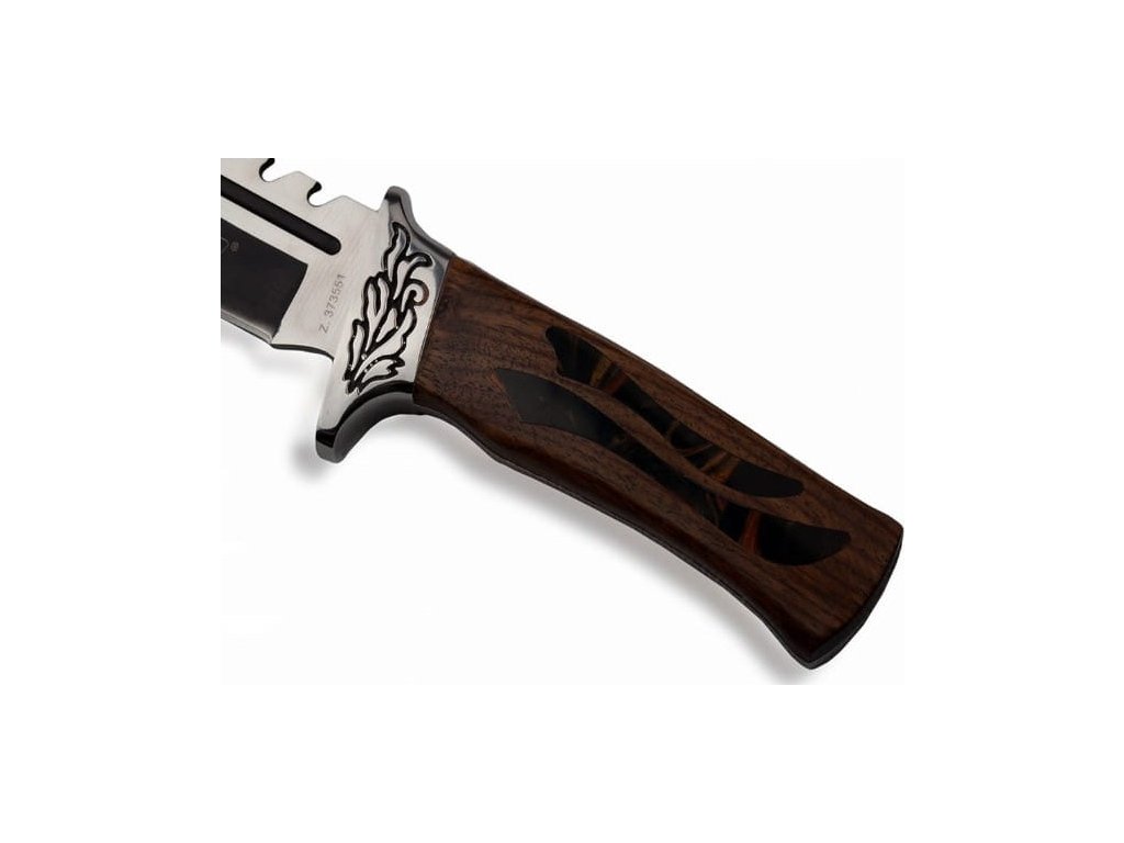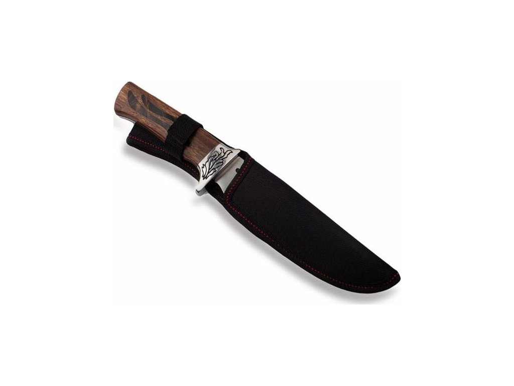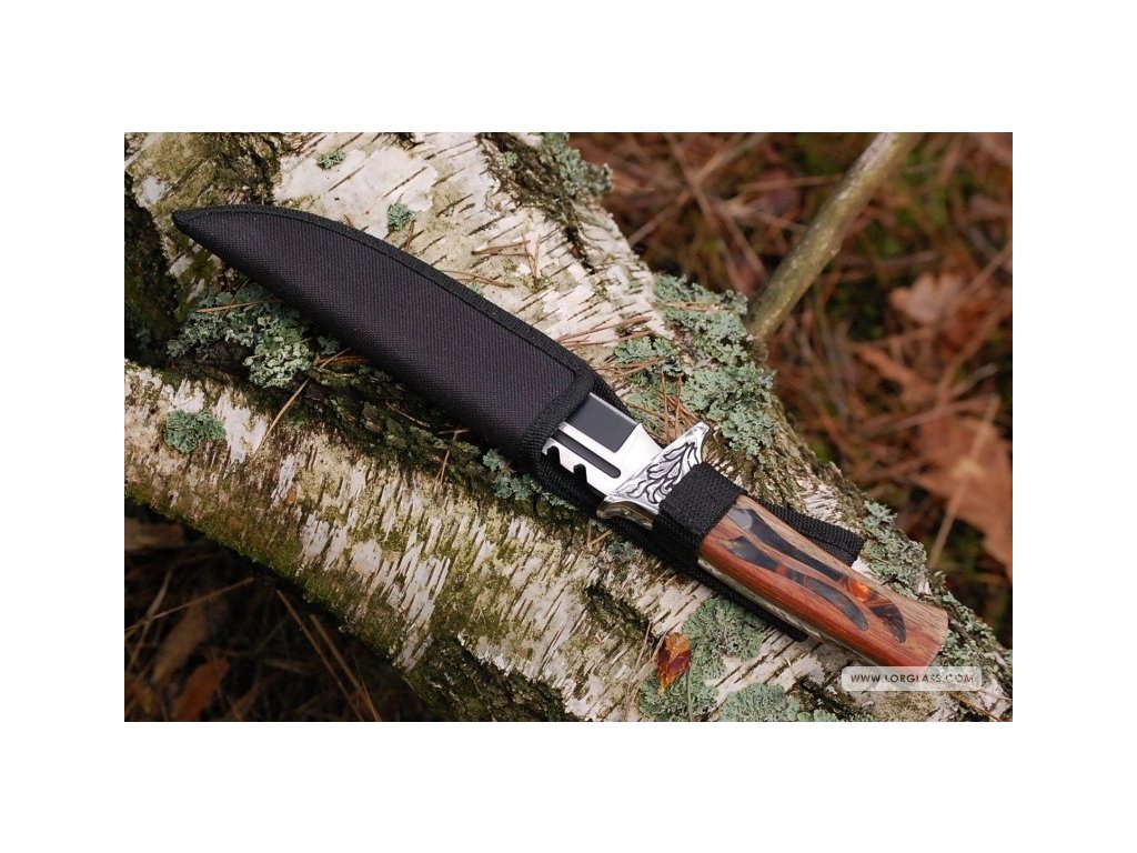 Střenky rukojeti tohoto nože jsou vyrobeny z dřevěného materiálu a nůž celkově perfektně padne do ruky. Součástí je nylonové pouzdro k bezpečnému uložení a k nošení na opasku.