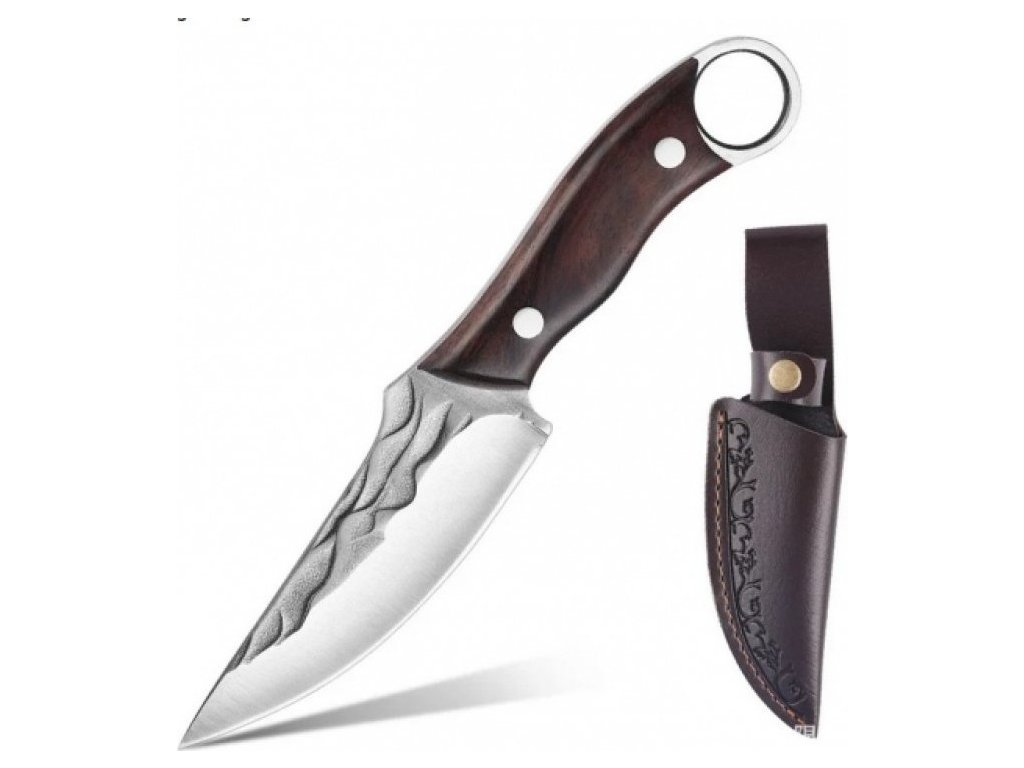 Lovecký nůž je dodáván s koženým pouzdrem, které lze připevnit na opasek nebo batoh.
