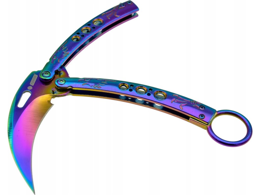 - Okouzlující balisong se zahnutou čepelí v duhových barvách.