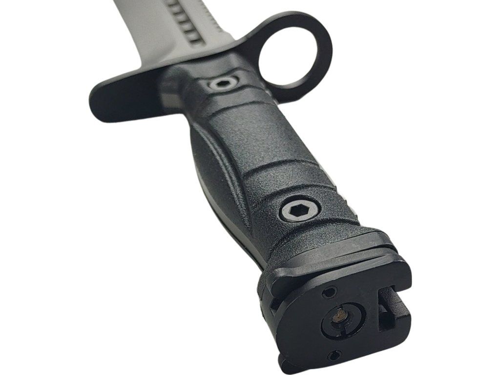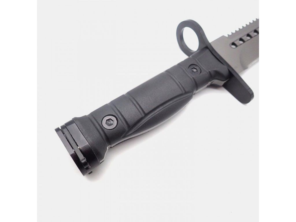 Multifunkční a robustní full-tang bajonet s pilkou, řezačkou na pletivový drát, brusným kamenem, a možností nasazení na útočnou pušku.