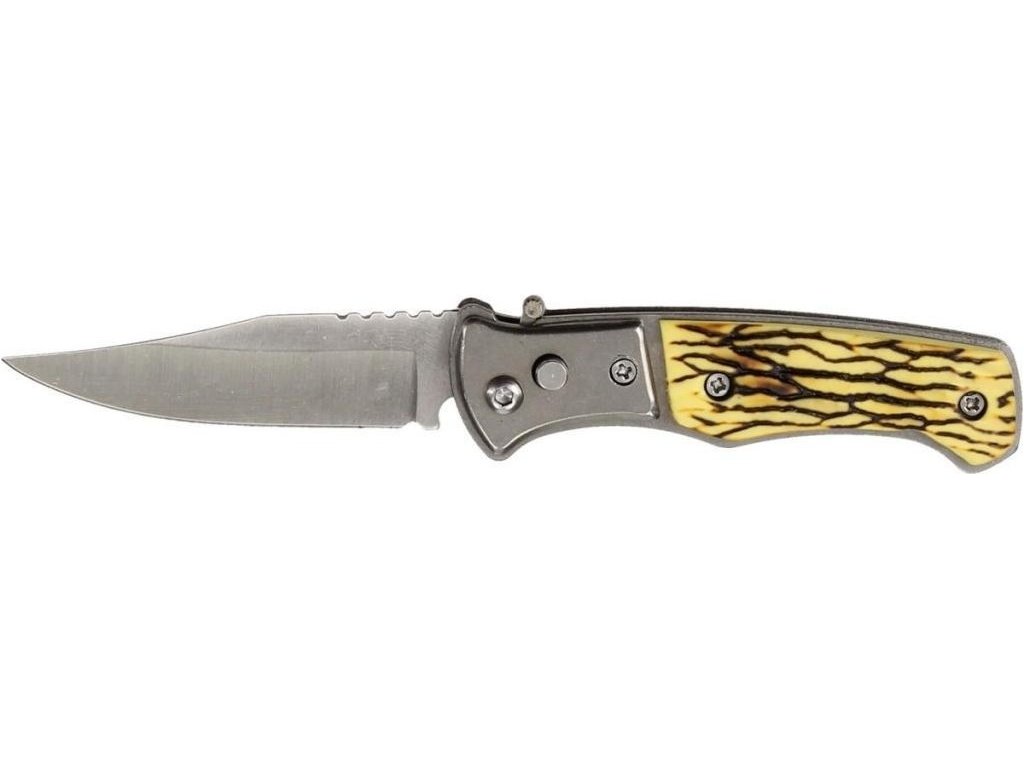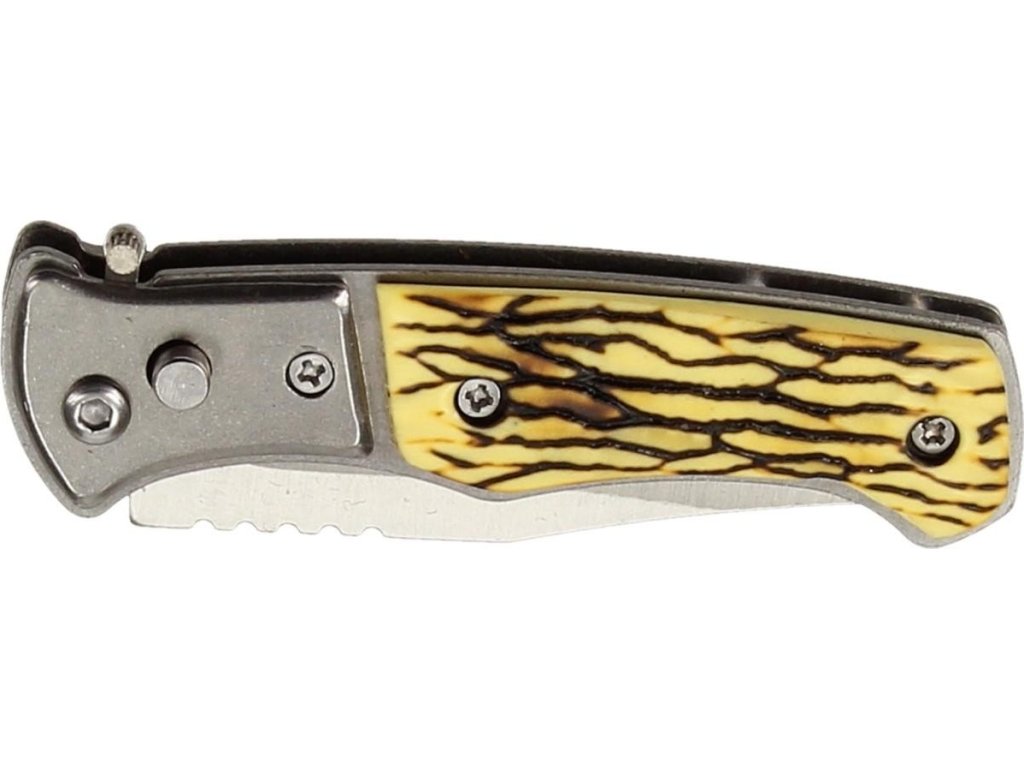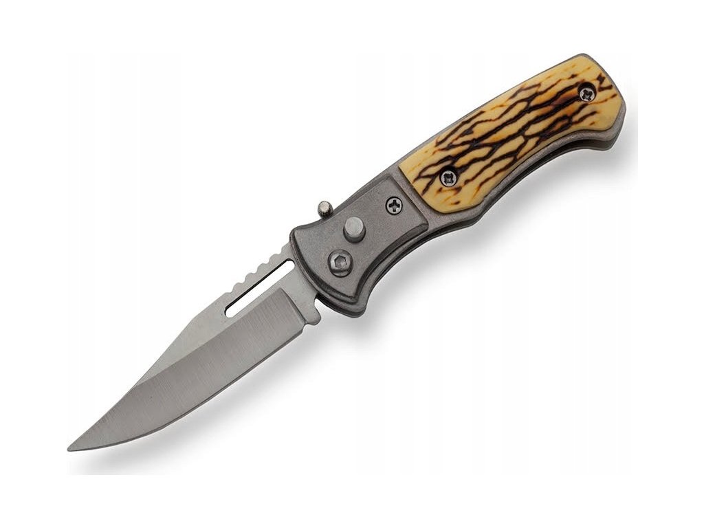 - Kapesní vystřelovací (automatický / pružinový) nůž s rukojetí imitace jelení kosti, zhotovené z pryskyřice.