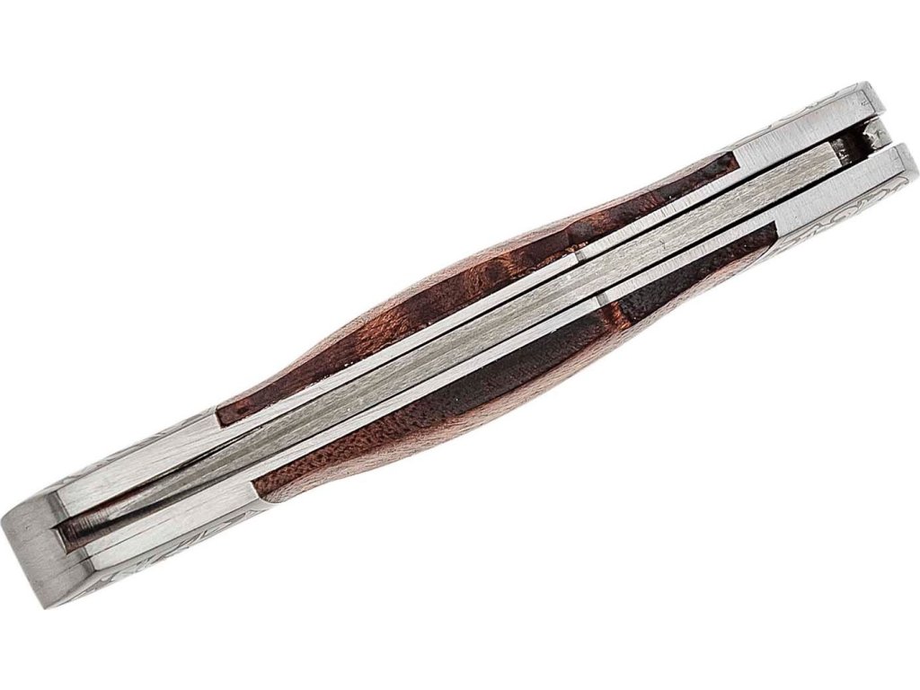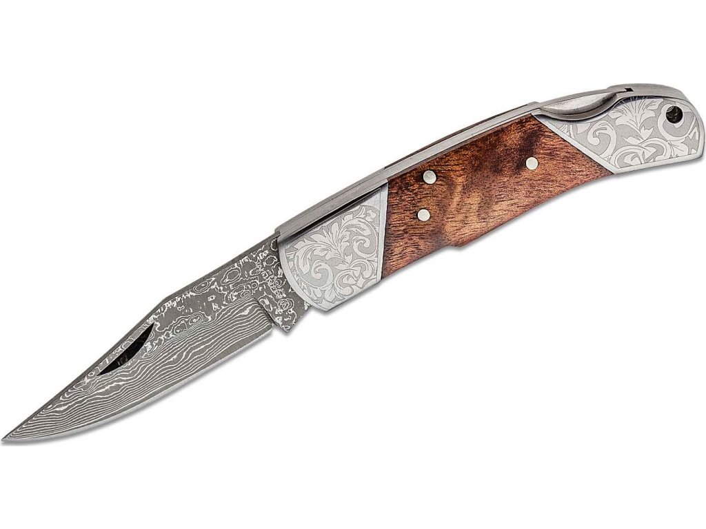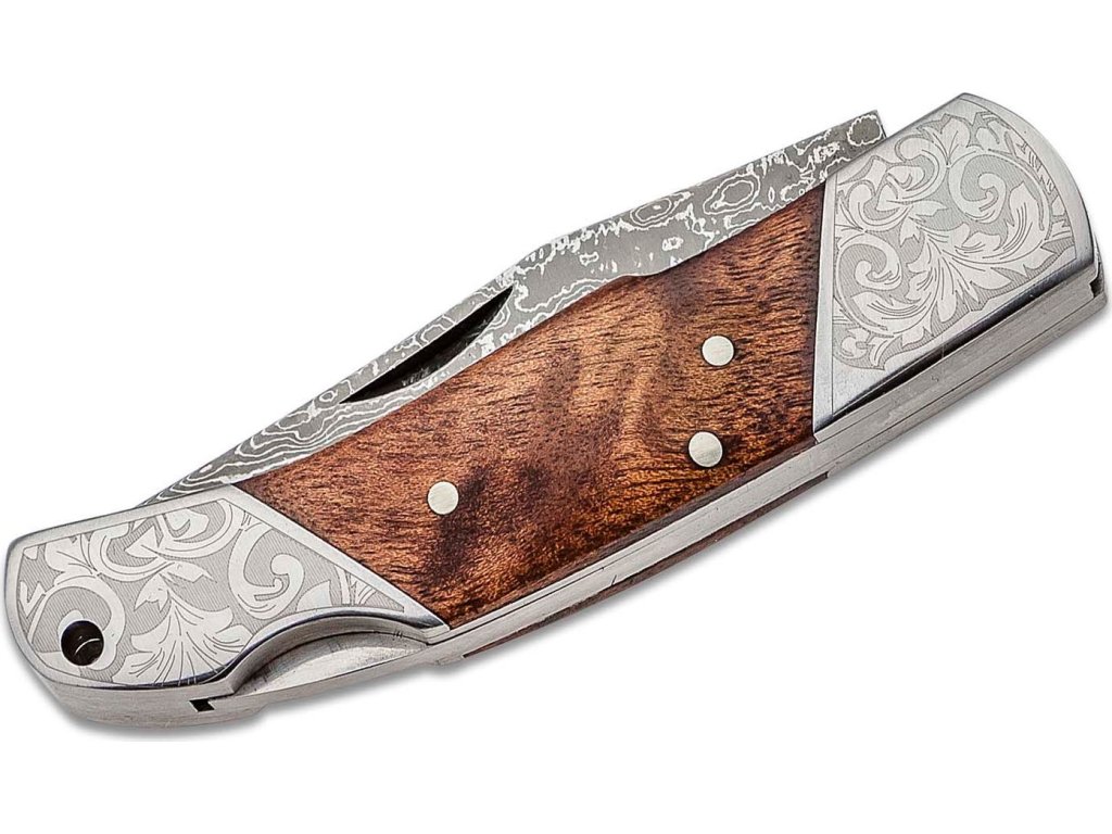 Tento nádherný a praktický nůž na Vás udělá dojem. Damašková čepel s 37 vrstvami se svou jemnou damaškovou strukturou a dekorativně leptaným bolsterem zdůrazňují hodnotu nože. Ručně vybroušené dřevěné střenky rukojeti zaručují vynikající úchop. Nůž Damascus Duke je navzdory veškeré eleganci plnohodnotným užitkovým nožem s pojistkou Lockback proti nechtěnému zavření nože při práci a otvorem pro šňůru, který se perfektně osvědčil při každodenním používání.
