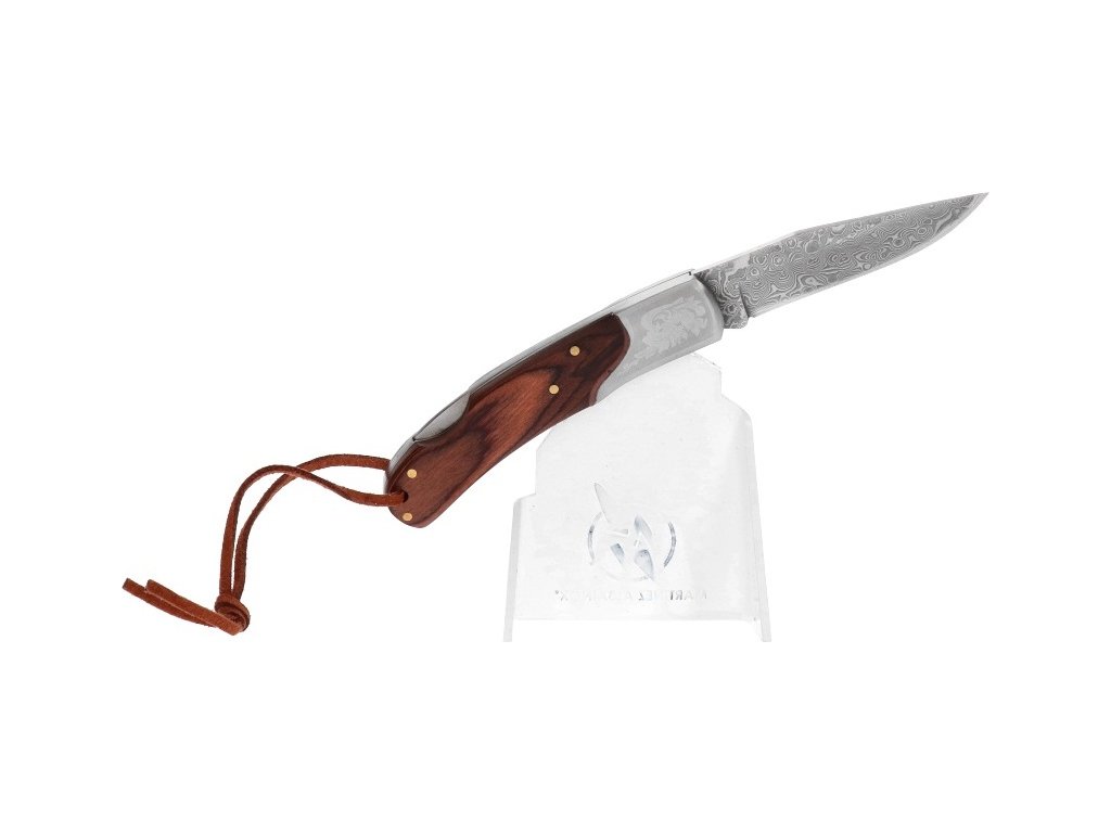 Nádherný a praktický zdobený nůž s damaškovou čepelí se 73 vrstvami. Se svou jemnou damaškovou strukturou a dekorativně leptaným bolsterem zdůrazňují hodnotu nože. Střenky rukojeti z hnědé mikarty zaručují vynikající úchop a odolnost. Nůž Damascus je navzdory veškeré eleganci plnohodnotným užitkovým nožem s pojistkou proti nechtěnému zavření nože při práci a otvorem pro šňůru, který se perfektně osvědčil při každodenním používání.
