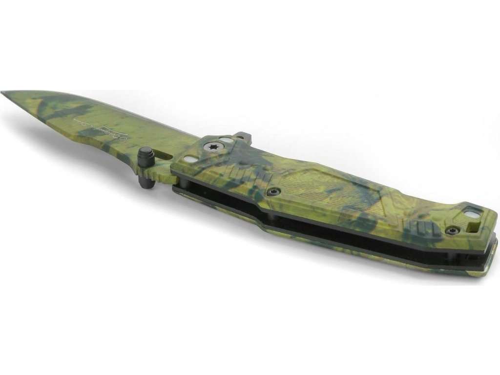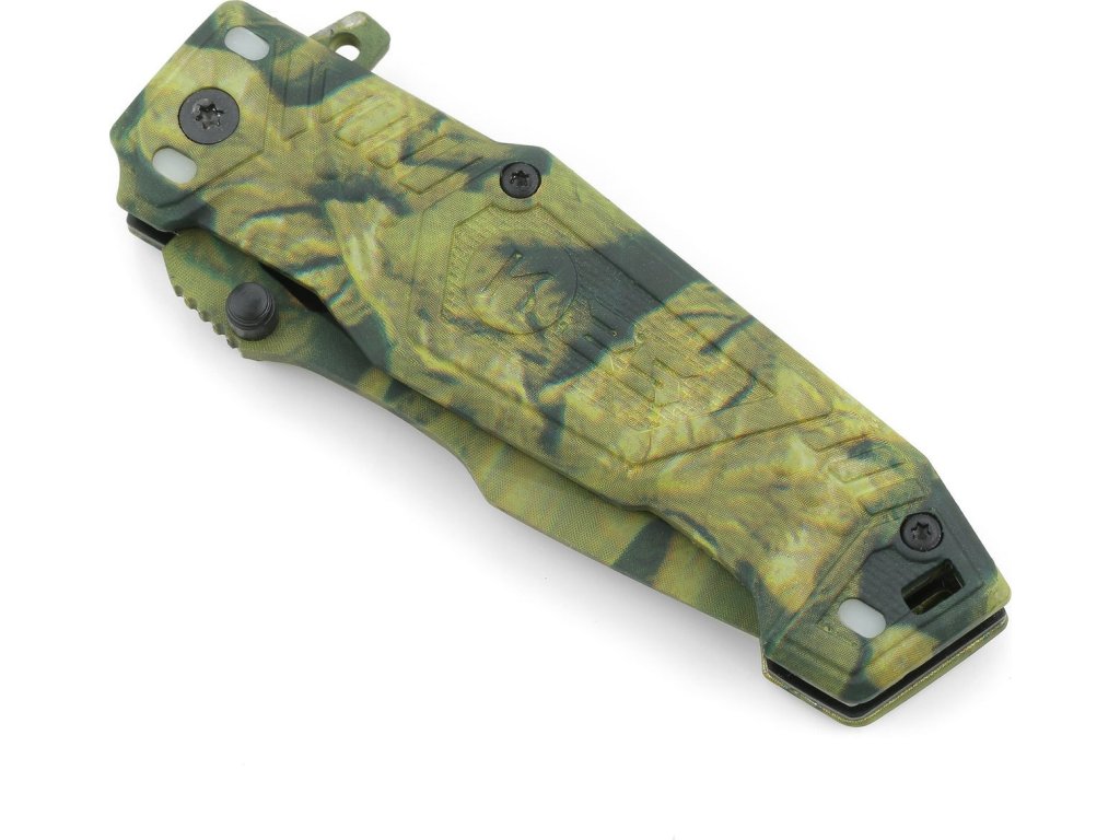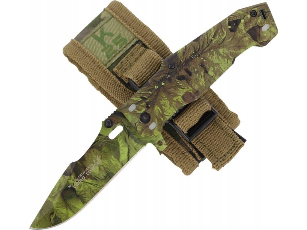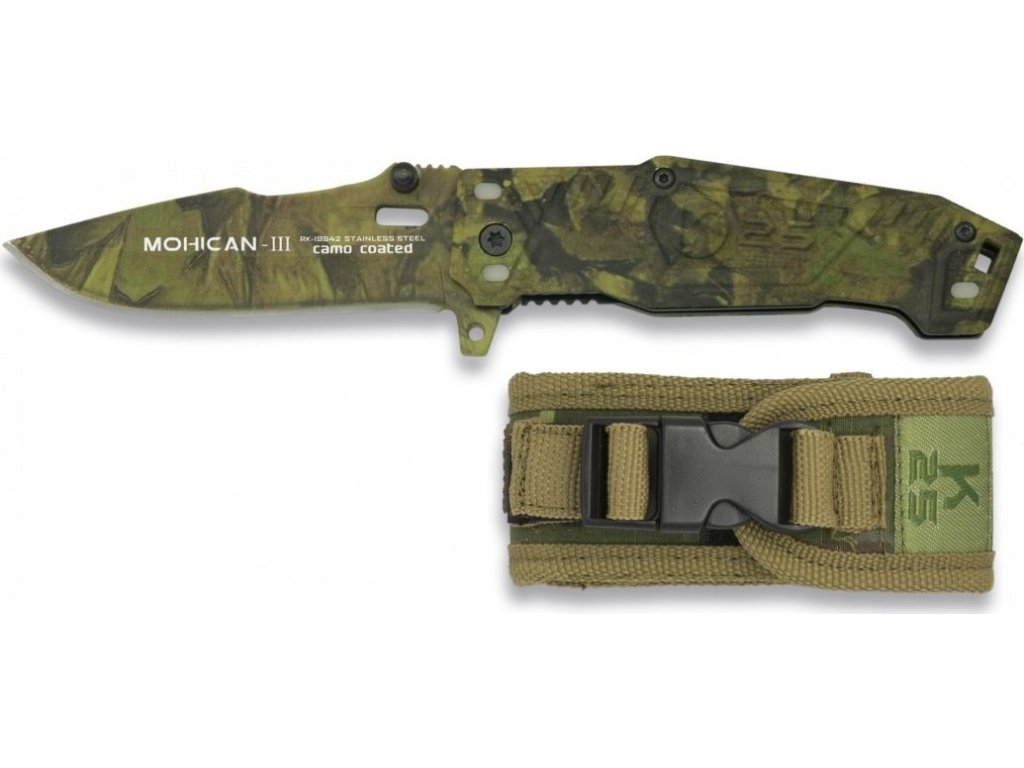 Zavírací nůž španělské značky K25 ze série Mohican, do které patří tři páry nožů, přičemž každý pár tvoří pevný a zavírací nůž ve stejném stylu. Nože jsou určené zejména pro pobyt v přírodě a outdoorové aktivity. Čepel je vyrobena z nerezové oceli 7Cr17Mov s titanovým povrchem, který zlepšuje vlastnosti čepele a odolnost proti opotřebení. Na čepeli je oboustranný kolíček pro snadné otevírání jednou rukou. Nůž lze rovněž otevřít zatlačením na "flipper" vystupující ze hřbetu rukojeti a současným švihnutím zápěstím. Nůž je opatřen vnitřní bezpečnostní pojistkou Liner-Lock, otvorem pro šňůru a fosforeskujícími prvky na rukojeti pro snadnější nalezení nože ve tmě. Střenky jsou hliníkové a celý nůž je v lesním maskovacím provedení Realtree® Camo. Nůž je dodáván se zeleným nylonovým pouzdrem s upínací vazbou systému MOLLE.