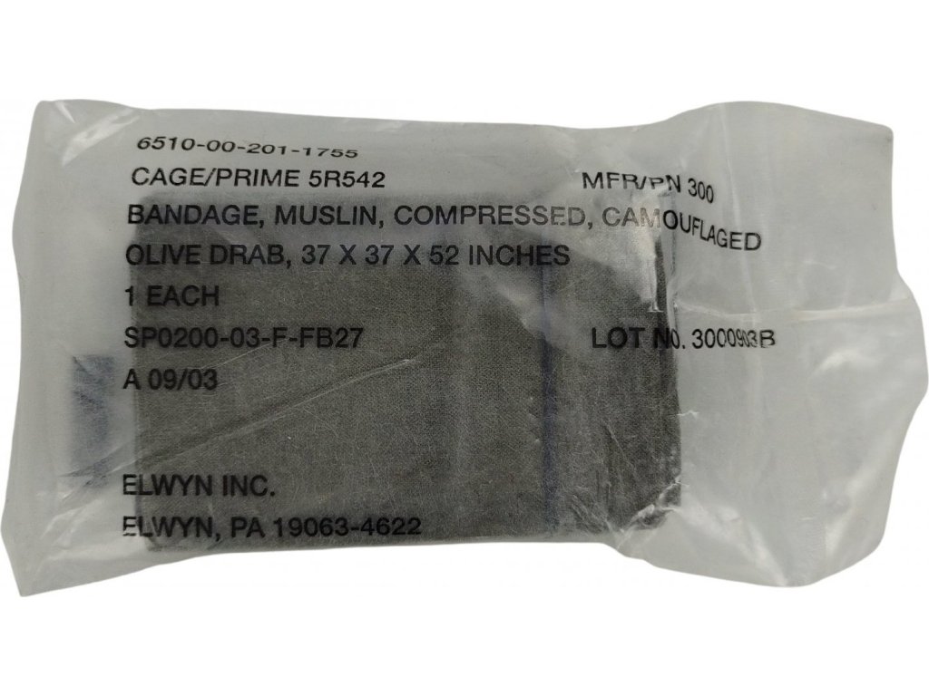 - BANDAGE, MUSLIN, COMPRESSEED, CAMOUFLAGED OLIVE DRAB, 37 X 37 X 52 INCHES