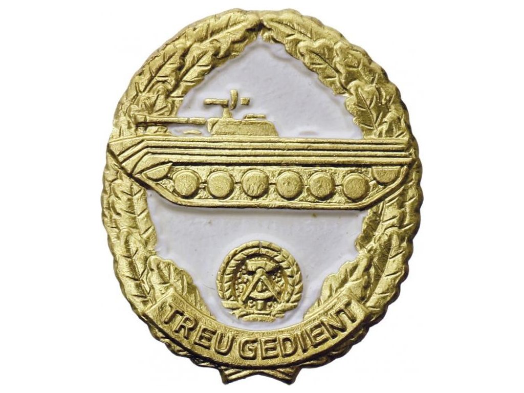 - odznak pozemních sil NVA znázorňuje ve zlatém čestném věnci tank BMP (sovětské bojové vozidlo pěchoty), státní znak - erb NDR a německý text „TREU GEDIENT“ (sloužil věrně)