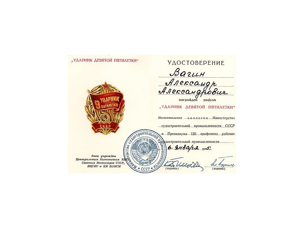 Odznaky „Úderník (9-10-XI-XII) pětiletý plán“ jsou zahrnuty v seznamu ministerských insignií při porodu, což jim dává právo získat titul „Veterán práce“.