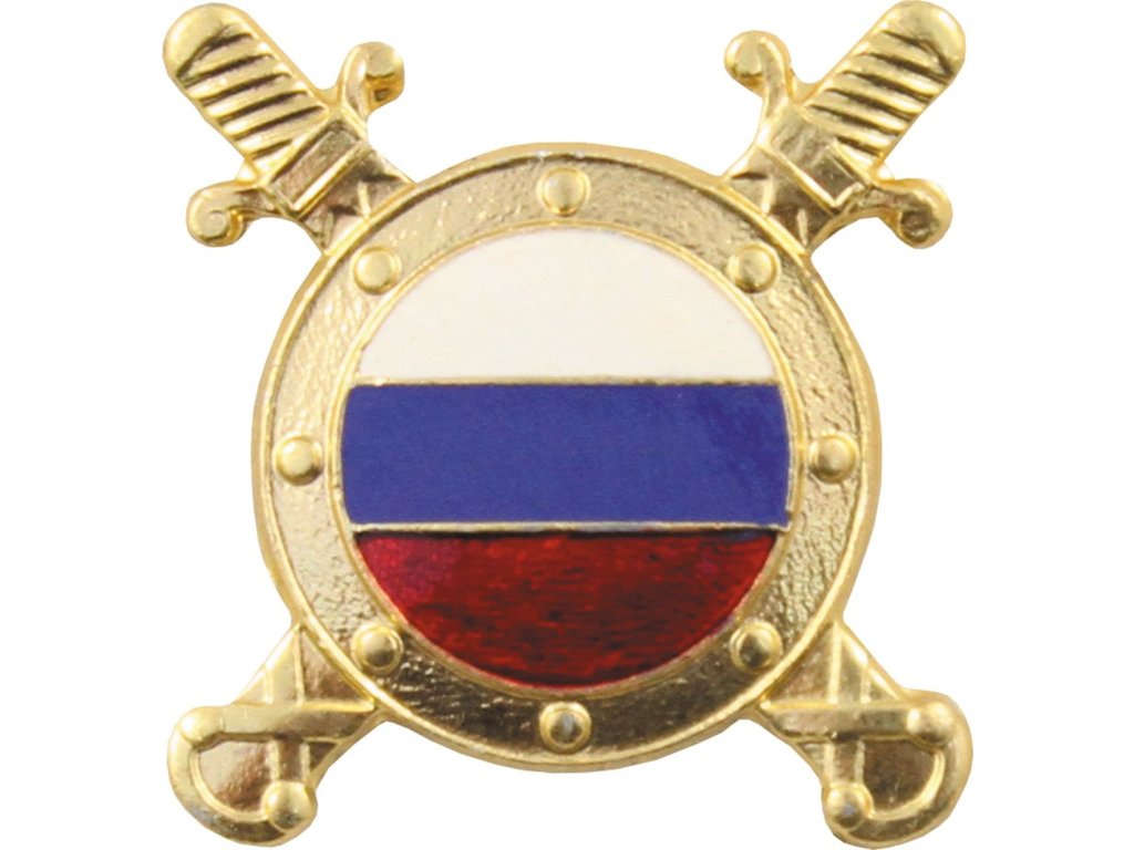 - kovový znak v podobě zkřížených mečů a kulatého štítu s vyobrazením ruské vlajky