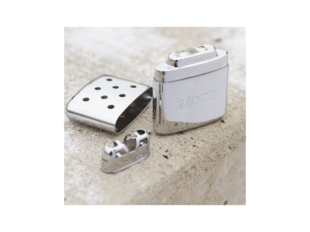 Kovový benzinový outdoorový kapesní ohřívač Zippo® 41063 v lesklém chromovaném provedení. Je navržen tak, aby vydržel i v náročných podmínkách. Štíhlý tvar umožňuje pohodlné nošení v kapse. Po zapálení vzniká teplo při katalytickém procesu v platinovém hořáku bez plamene. Na jedno naplnění vydrží ohřívač rukou hřát až 12 hodin, navíc prakticky bez zápachu. Součástí je nádobka na plnění benzinem a ochranné pouzdro. Doporučujeme používat originální benzin Zippo®.