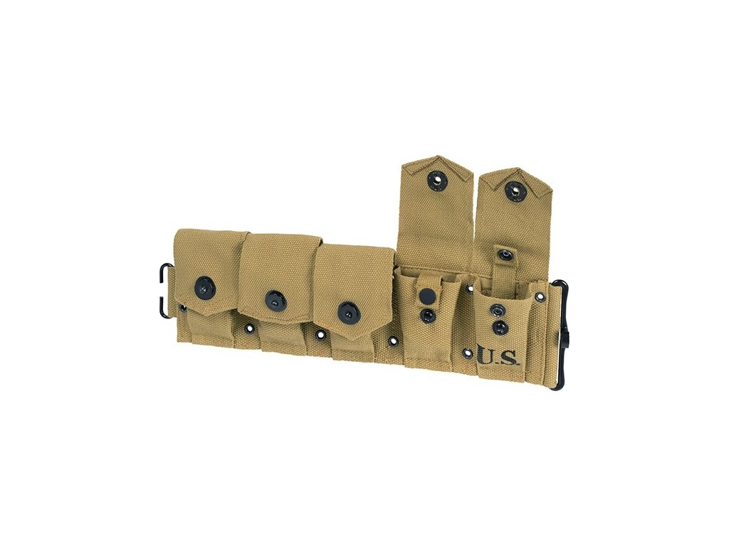 - Opasek má deset kapes, každá z nich pojme jeden rámeček s osmi náboji do pušky M1 Garand.