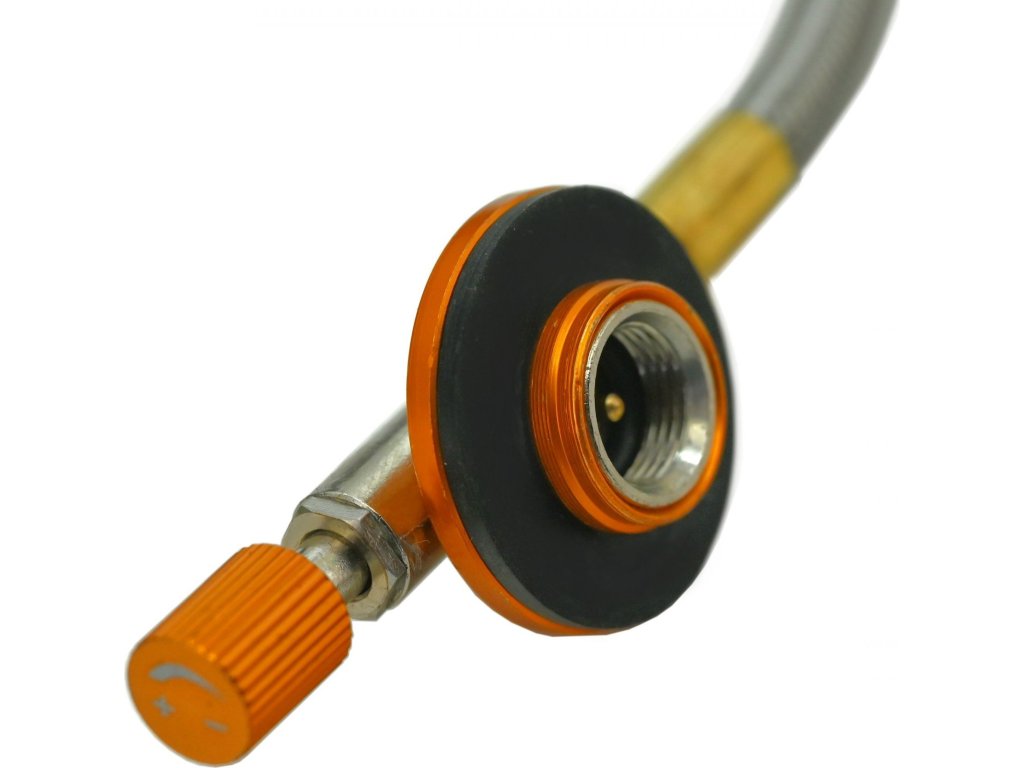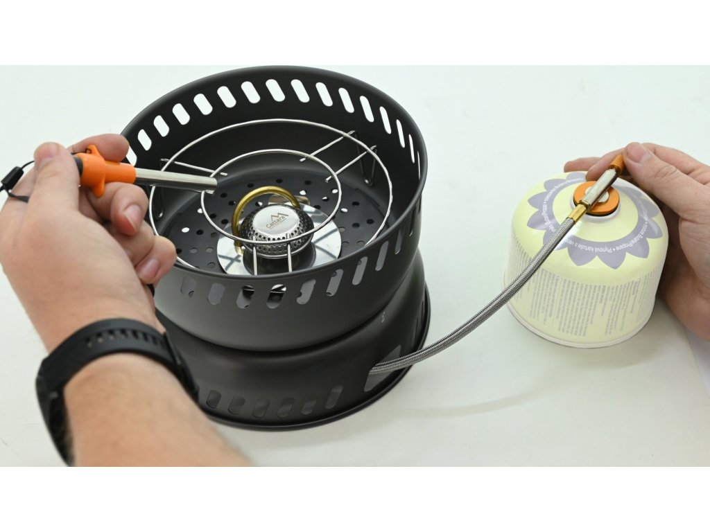 Samotný hořák je opatřený hadicí s ocelovým opletem délky 60 cm, zakončený regulátorem pro pohodlné nastavení průtoku plynu, pro přesné nastavení velikosti plamene. Regulátor je opatřen těsněním o rozměrech 30 x 2 mm a závitem 7/16" pro našroubování ke kartuši s propan-butanem, která musí být vyrobena dle EN 417 a opatřena samotěsnícím ventilem s připojovacím závitem 7/16“. Hořák díky své konstrukci s předehřívačem plynu umožňuje použití při nízkých teplotách a ve vysokých nadmořských výškách. Pro zapálení hořáku je v sadě přiložen praktický piezo zapalovač.
