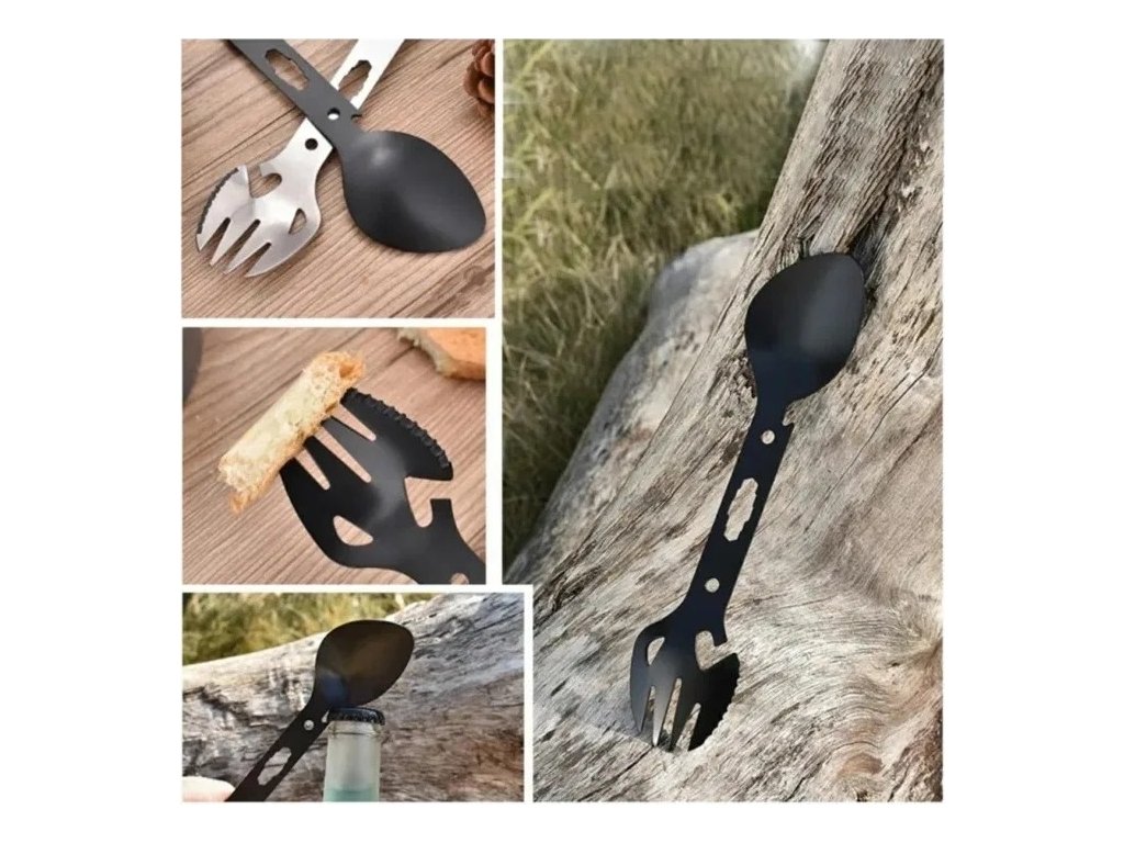 Multifunkční lžíce: Multifunkční příbor 7 v 1, včetně lžíce, vidličky, otvíráku na lahve, otvíráku na konzervy, zoubkovaného nože a klíče, perfektní pro venkovní přežití a pobyty mimo civilizaci.