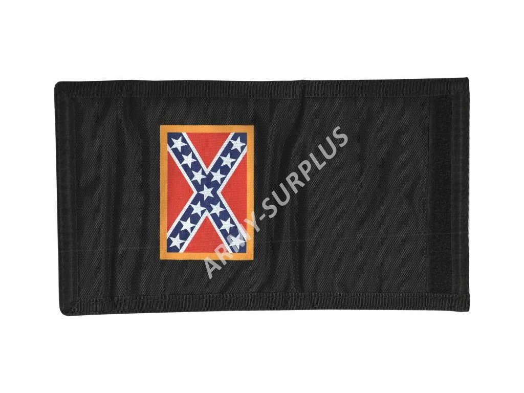 Peněženka je černá, skládací a na přední straně má potisk s vlajkou Konfederace, známou také jako bojová vlajka Jižanů.