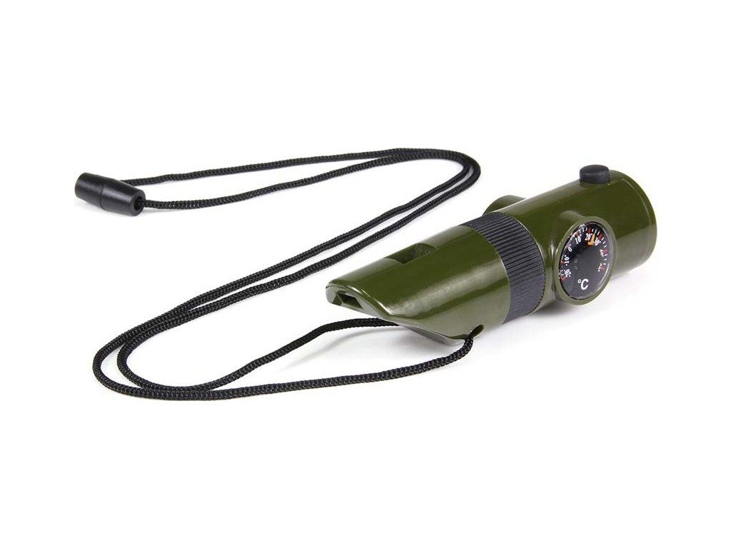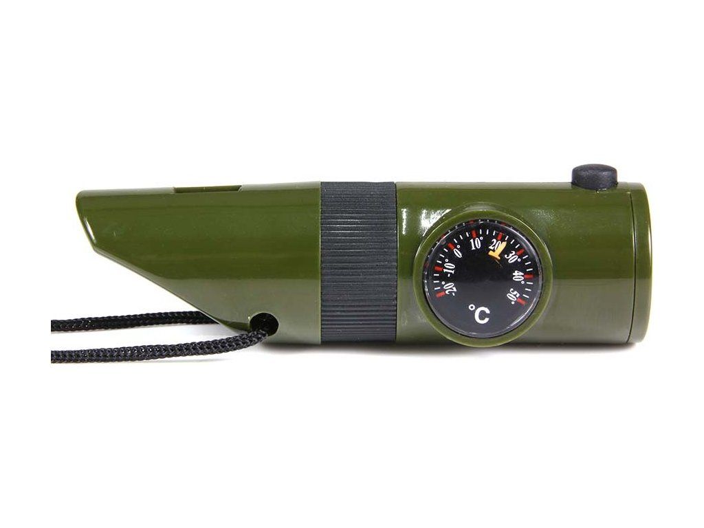 Multifunkční taktická píšťalka pro přežití (7 v 1) v olivově zelené barvě.
