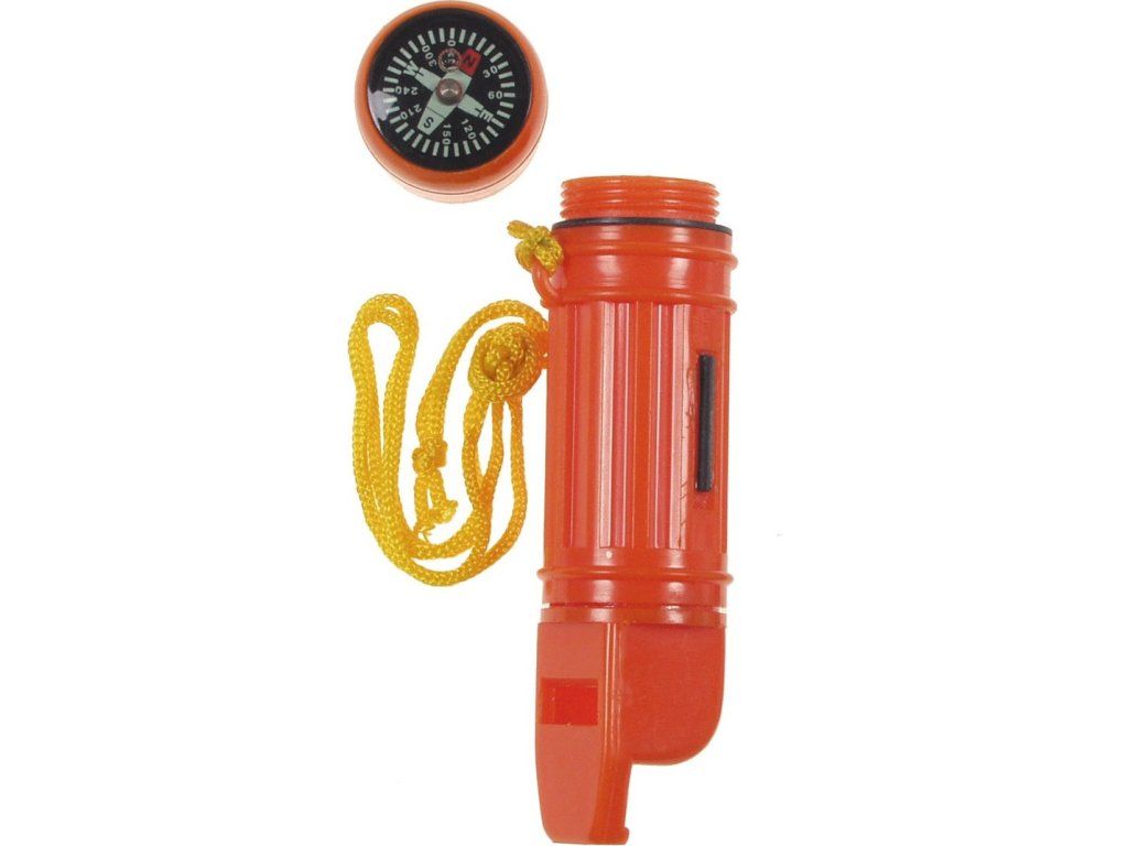 Multifunkční nástroj: Obsahuje píšťalku, kompas, zrcátko pro signalizaci, křesadlo pro rozdělání ohně a vodotěsnou schránku na drobnosti.
