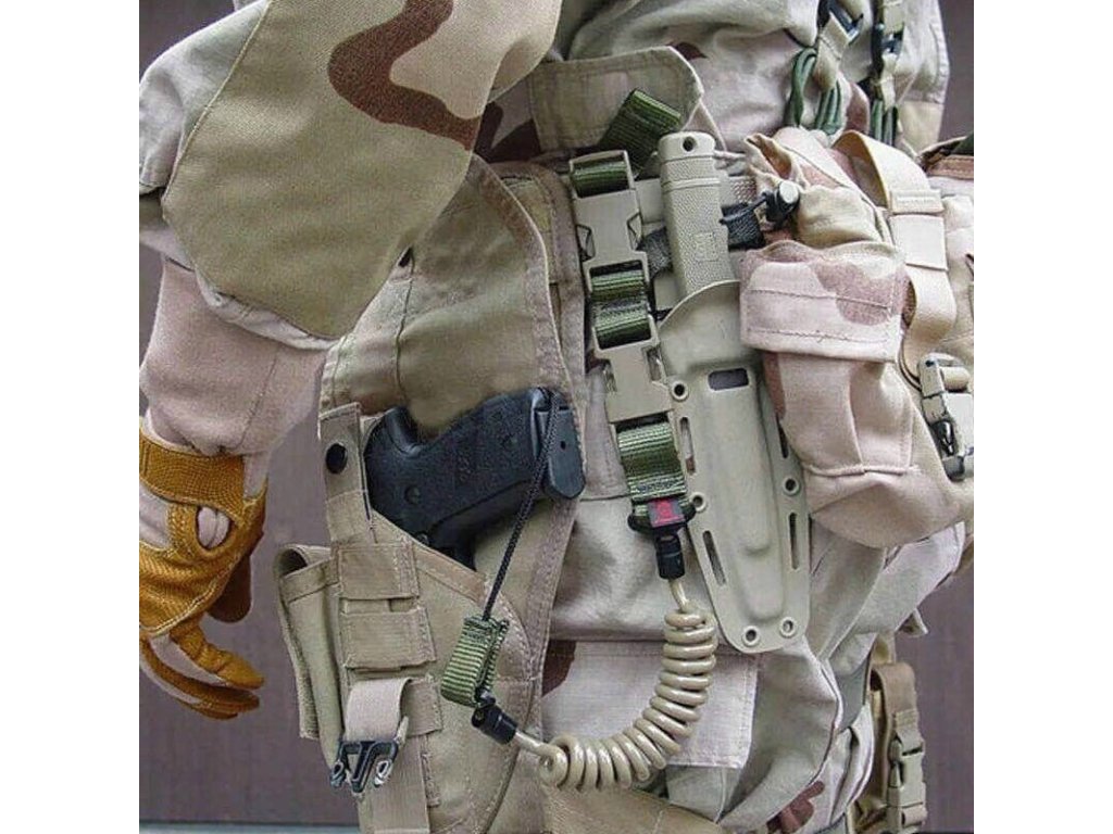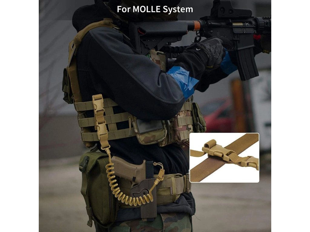 - Taktický zatahovací pružinový popruh, bezpečnostní, který chrání krátkou zbraň proti ztrátě.