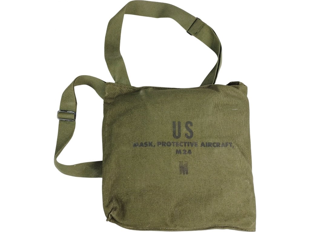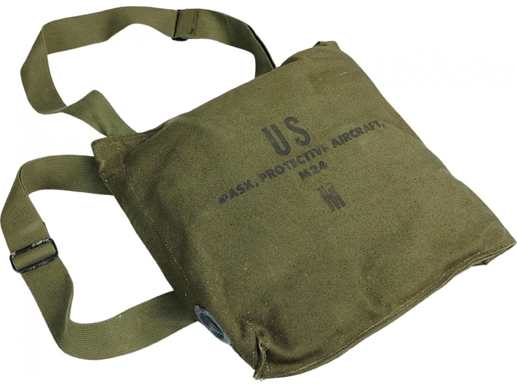 Vojenská protichemická maska M24 pro posádky letadel (Mask, Chemical-Biological: Aircraft, M24), včetně přepravního vaku a popruhu na filtr.