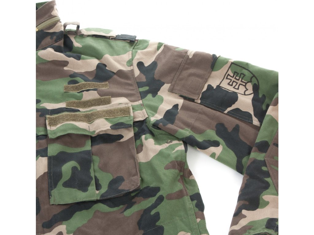 - Dvě přední velkoobjemové kapsy na ruce, náprsní kapsa na knoflíky, tři Velcro panely k uchycení nášivek na suchý zip.
