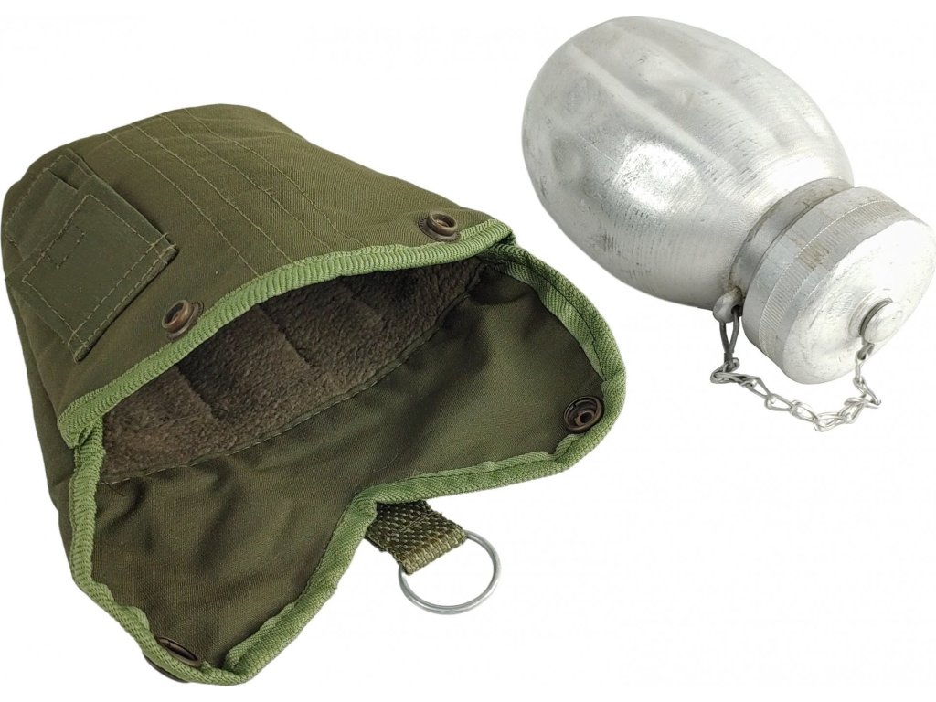 - Polská armádní tvarovaná hliníková láhev se širokým šroubovacím uzávěrem, opatřený řetízkem zamezující ztrátě víčka.