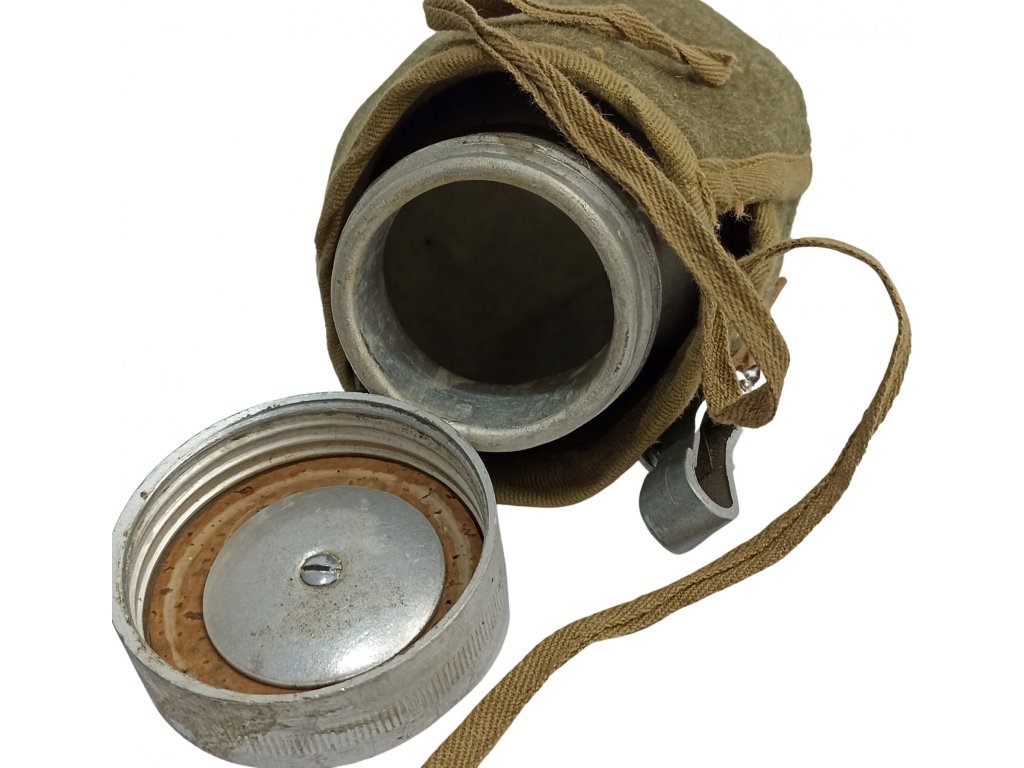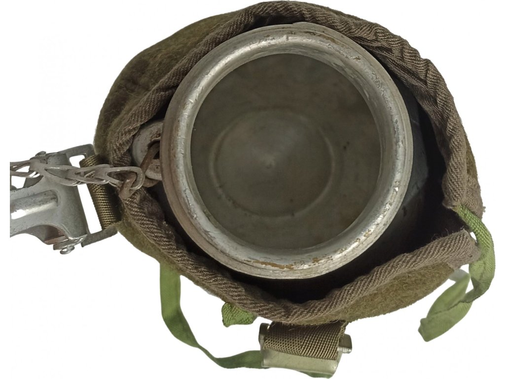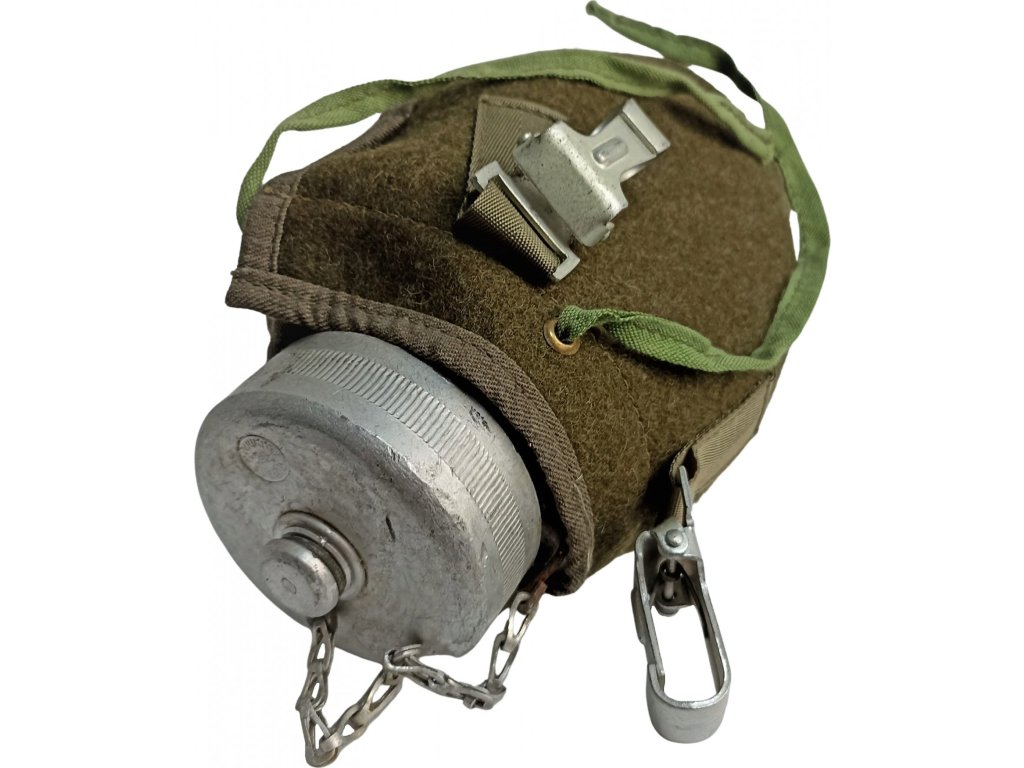 - Vojenská tvarovaná hliníková láhev se širokým šroubovacím uzávěrem, opatřený řetízkem zamezující ztrátě víčka.