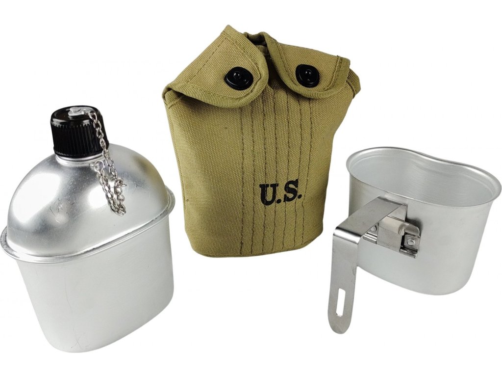 Polní láhev US M1910 hliníková čutora s hrnkem a obalem WWII Repro