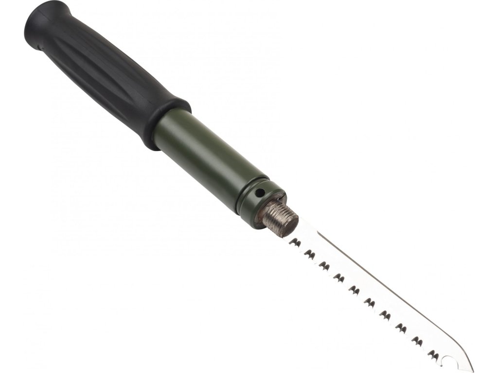 - Integrované nástroje: Uvnitř rukojeti se nachází křesadlo pro rozdělávání ohně, pracovní nůž/pilka, multifunkční klíč s otvírákem a kompas.