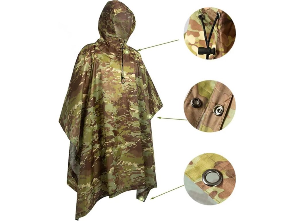 - Pončo zabraňuje promáčení oblečení a zaručuje pohodlí, to vše díky použití lehkého odolného Rip-Stop polyesteru pokrytého PU filtrem. Model je vybaven patentkami a poutky, a také šňůrkami pro nastavení prostorné kapuce.