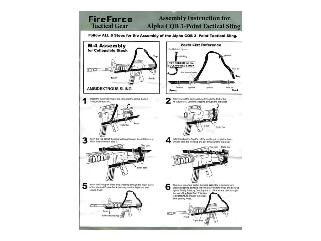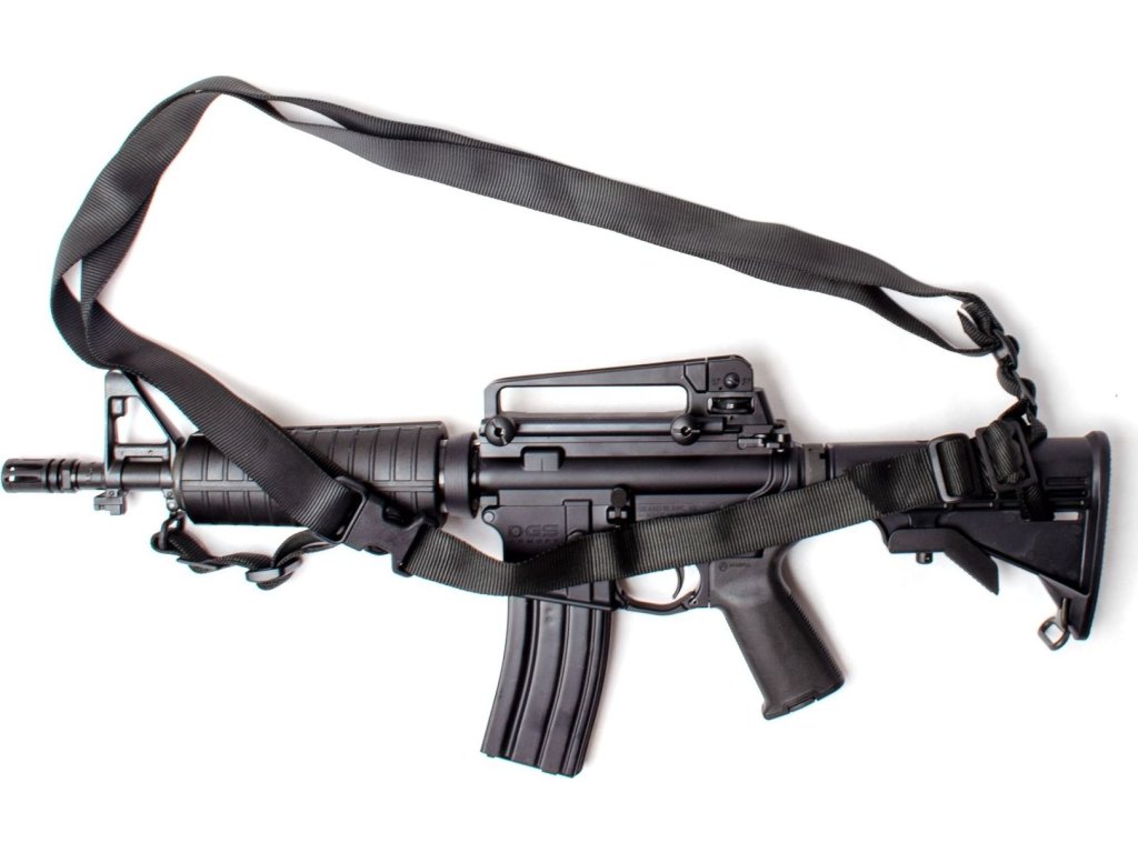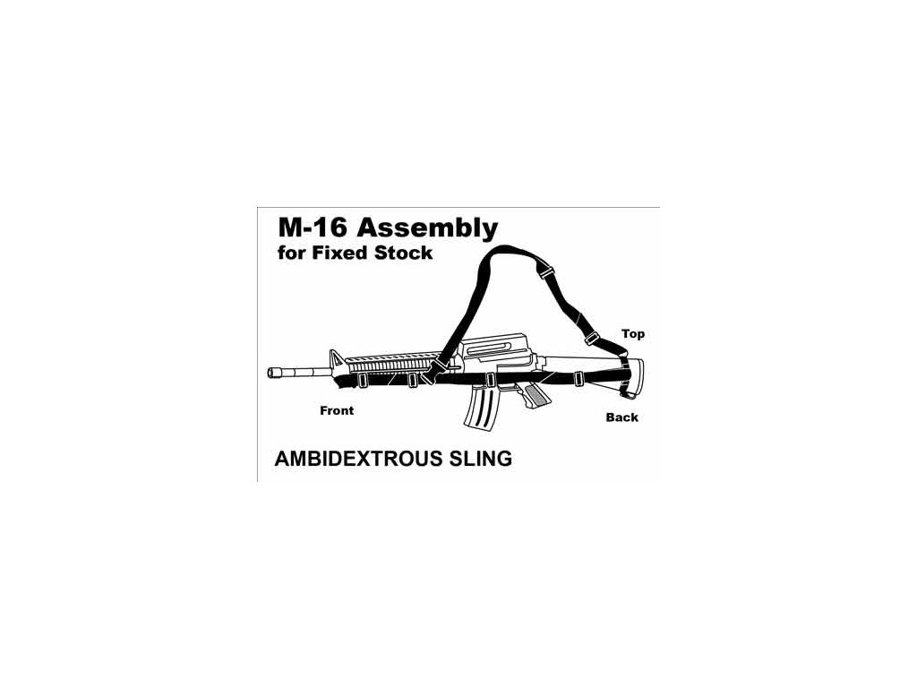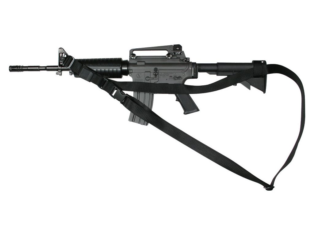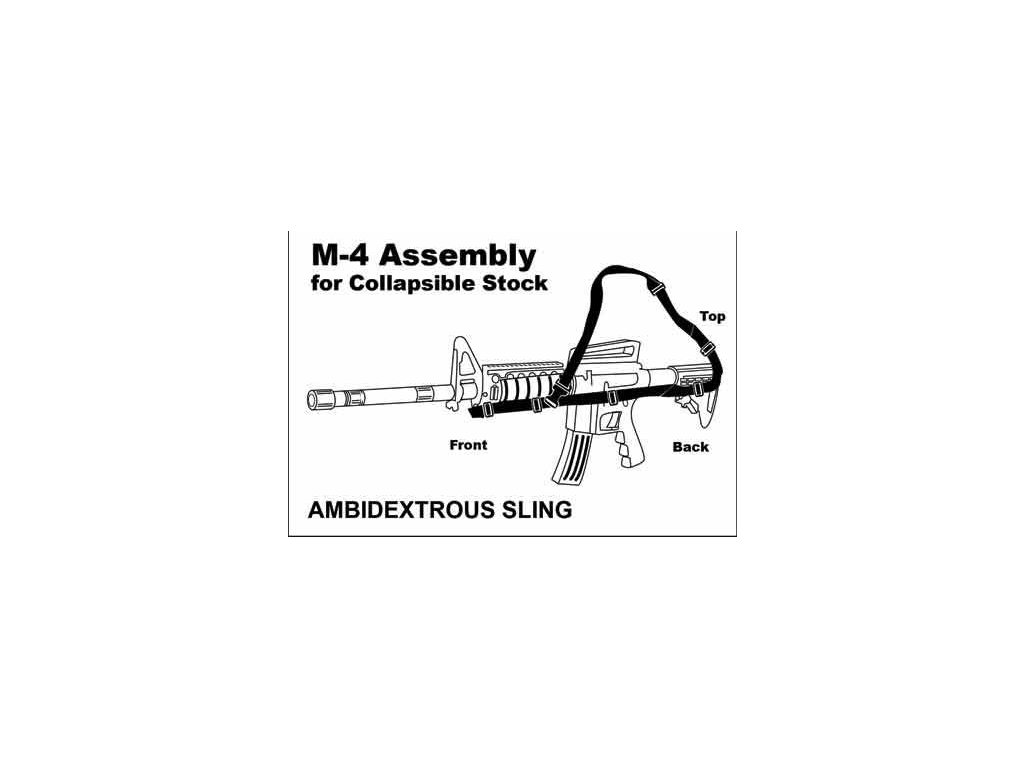 - Kvalitní, jednoduchý tříbodový popruh na útočnou pušku M-4 / M-16 a jejich podobné ekvivalenty.