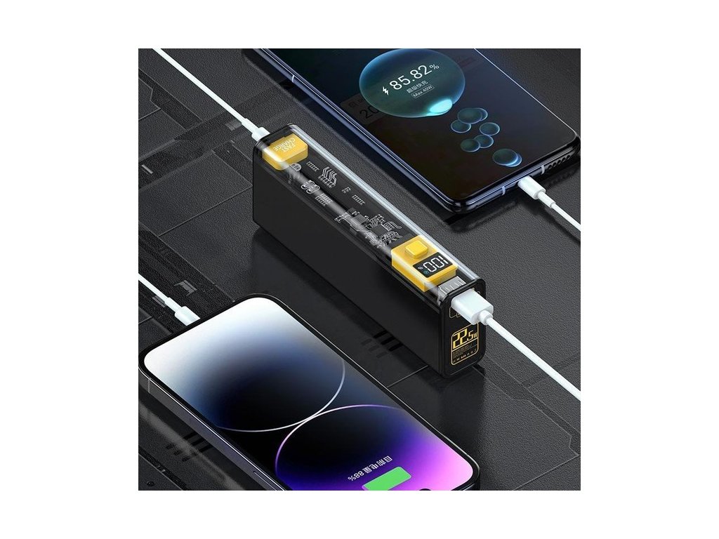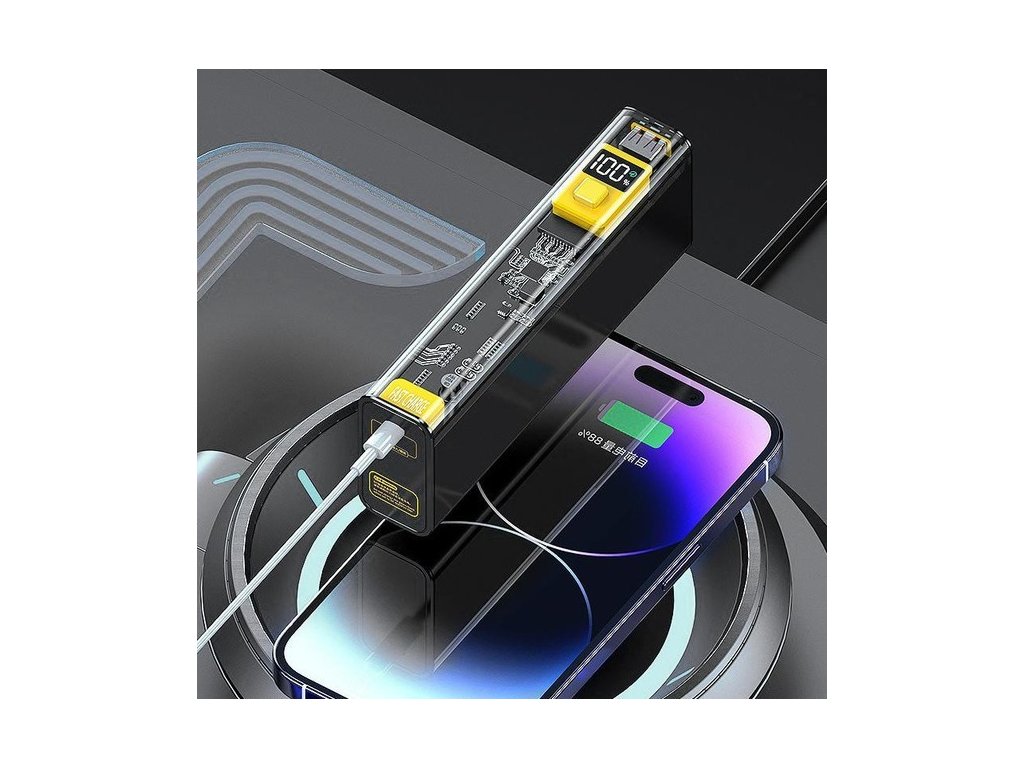 Powerbanka Cyberpunk kombinuje eleganci a špičkové technologie. Její transparentní a minimalistický design spolu s robustností vnitřní struktury ji odlišuje od ostatních přenosných baterií. Díky vysoce kvalitním bateriím a technologii kapacitě 20000 mAh a výkonu 22,5 W nabízí mimořádně rychlé a účinné nabíjení. Díky chytrému displeji pro sledování úrovně nabití, univerzálnímu připojení a možnosti nabíjet zařízení je nezbytným doplňkem pro každodenní použití.