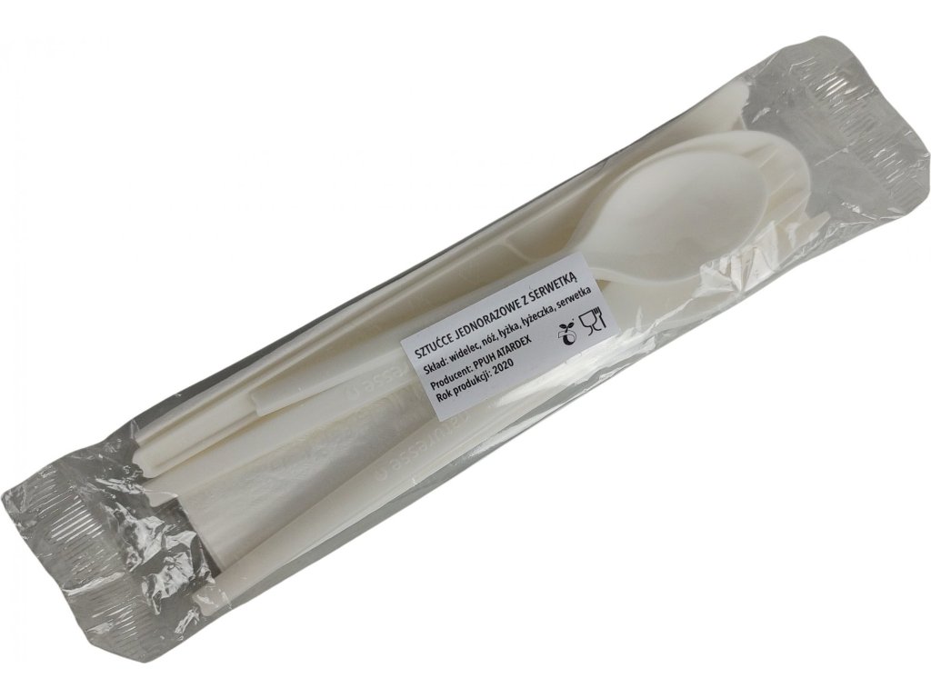 Vidlička, nůž, lžíce a lžička s papírovým ubrouskem, hygienicky balená v průhledném obalu. Lehký, skladný a levný příbor na cesty a stravování venku. Opakovaně použitelné. Vyrobeny z polystyrenu GPPS (General Purpose Polistyren), certifikovaného pro styk s potravinami.