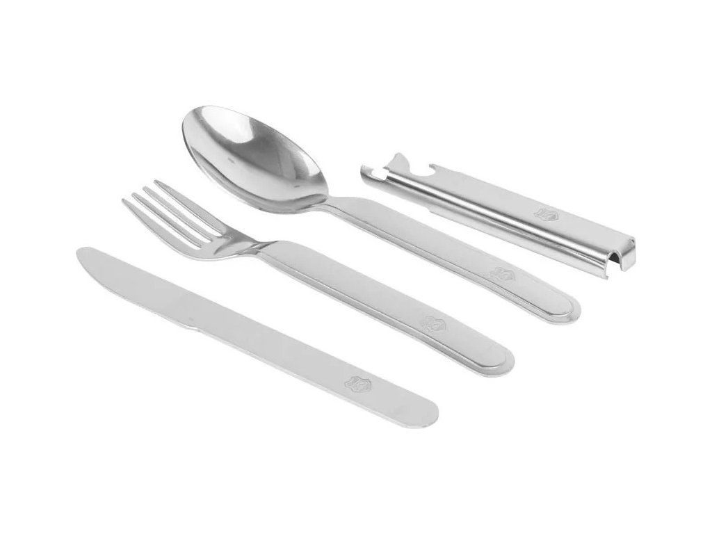 - Praktický příborový set obsahuje: plnohodnotná polévková lžíce, příborový nůž s vlnkovým ostřím, vidlička se čtyřmi hroty, praktický otvírák na láhve a a otvírák na konzervy.