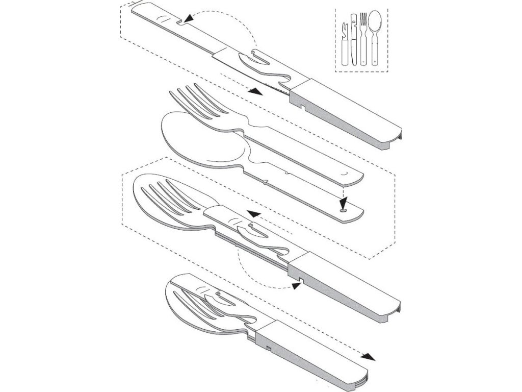 - Souprava jednotlivce obsahuje následující: nůž, lžičku, vidličku, otvírák na láhve a konzervy.