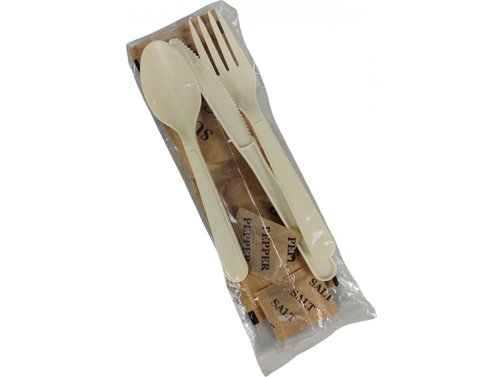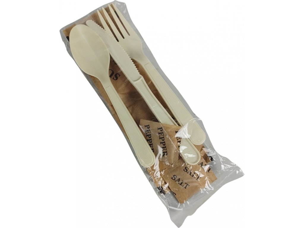 - Souprava opakovaně použitelných příborů z plastu s kapesníkem a dochucovacím kořením.