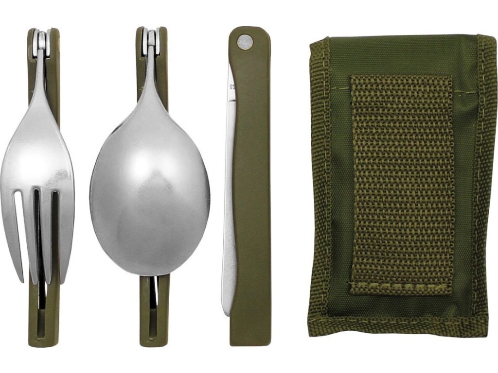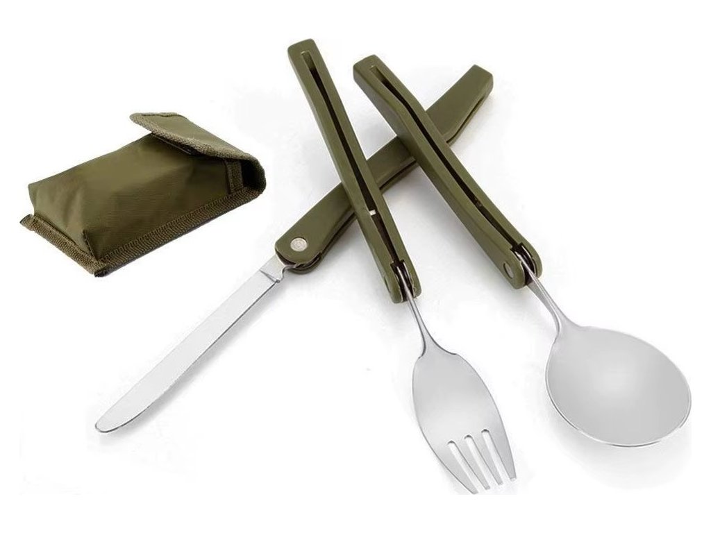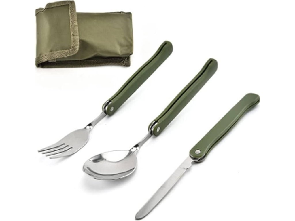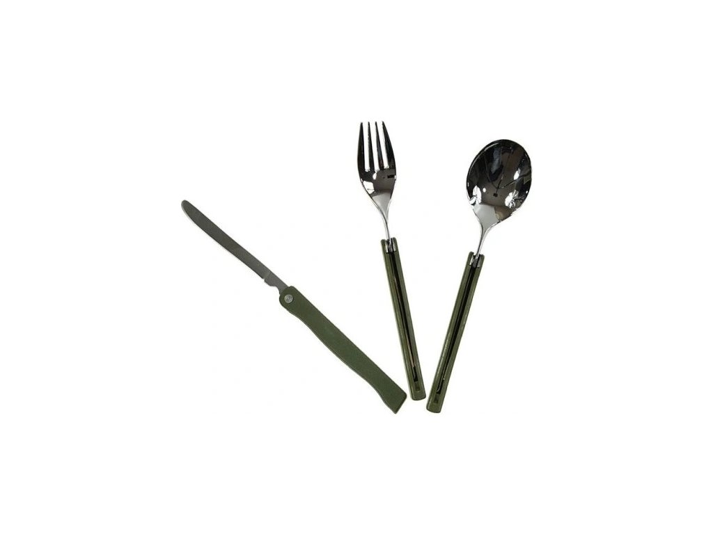 Trojdílný skládací nerezový příbor se střenkami ze zeleného plastu. Balen v nylonovém pouzdře s průvlekem na opasek. Délka cca 20 cm, celková hmotnost 110 g.