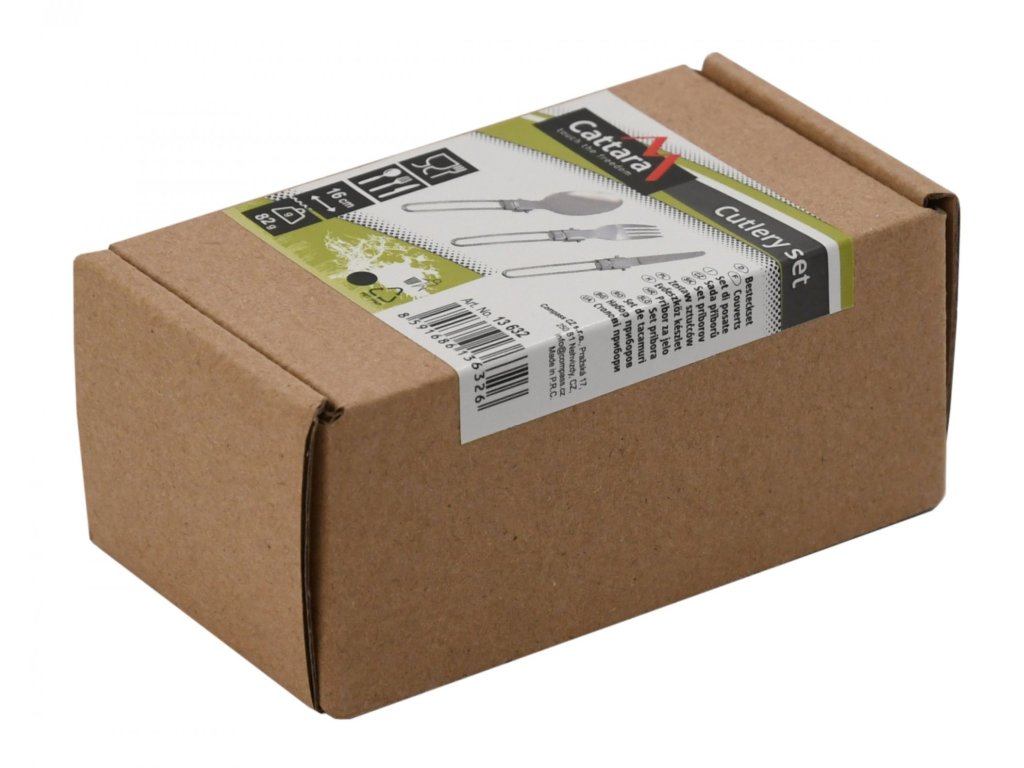 - Sada se skládá ze lžíce, nože a vidličky délky 16 cm s celkovou hmotností 80 g, uložených v textilním pouzdře s rozměry pouze 8 x 12 x 3 cm.