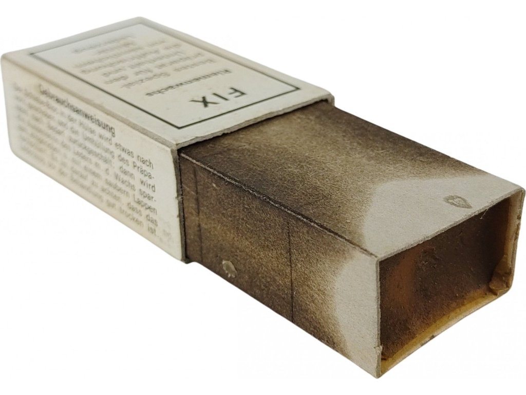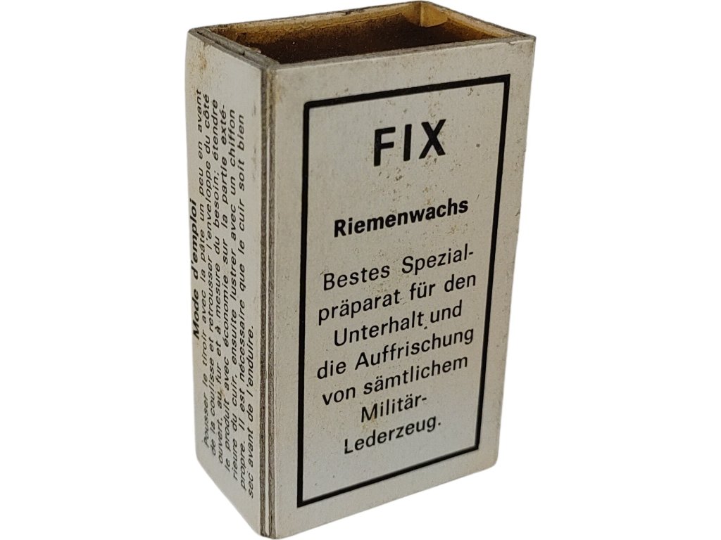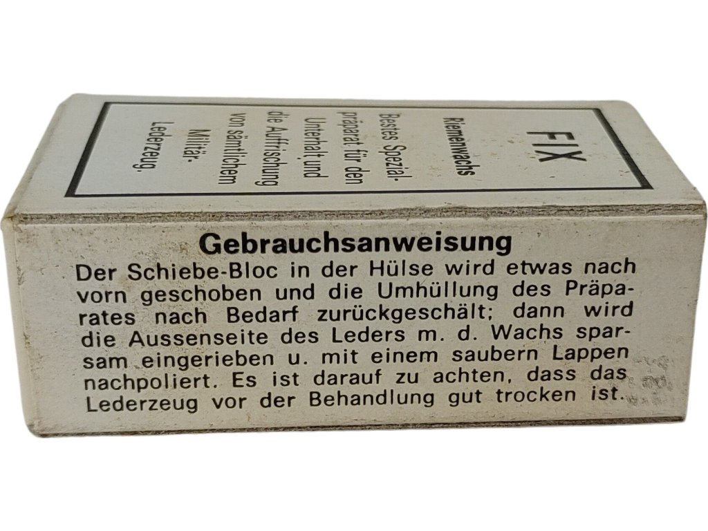 Přípravek FIX Riemenwachs, což v překladu znamená vosk na řemeny nebo kůži. Jedná se o speciální přípravek určený k údržbě a osvěžení veškerého vojenského koženého zboží.