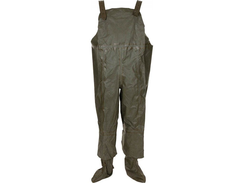- kalhoty s vysokým pasem doplněné o nosné treky a napevno spojené boty (délka stélky přibližně 28 cm)