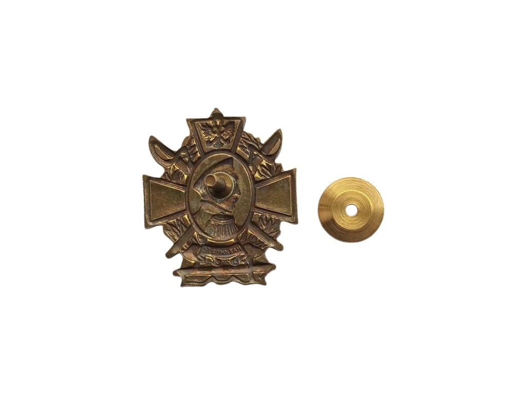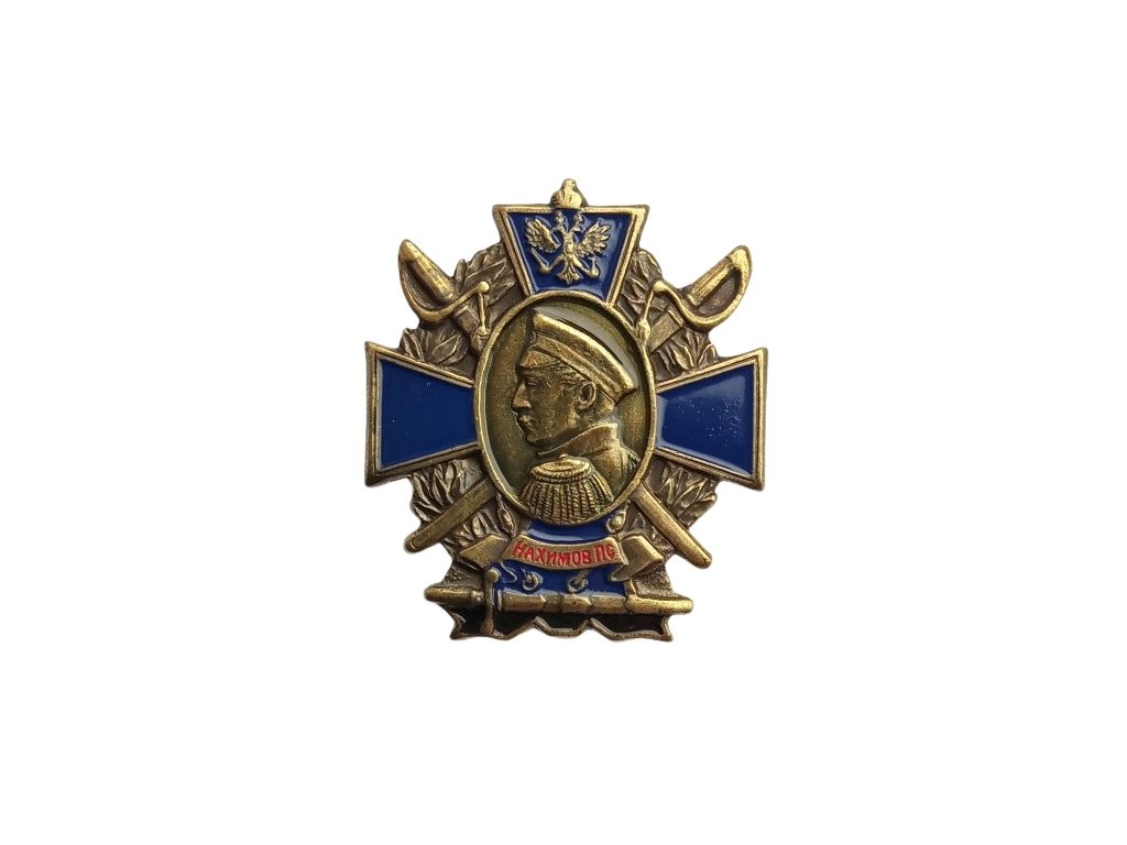Odznak ve tvaru modrého kříže s portrétem admirála ruského námořnictva P.S. Nachimova. Náprsní odznak je zlaté barvy a je vyroben z mosazi.